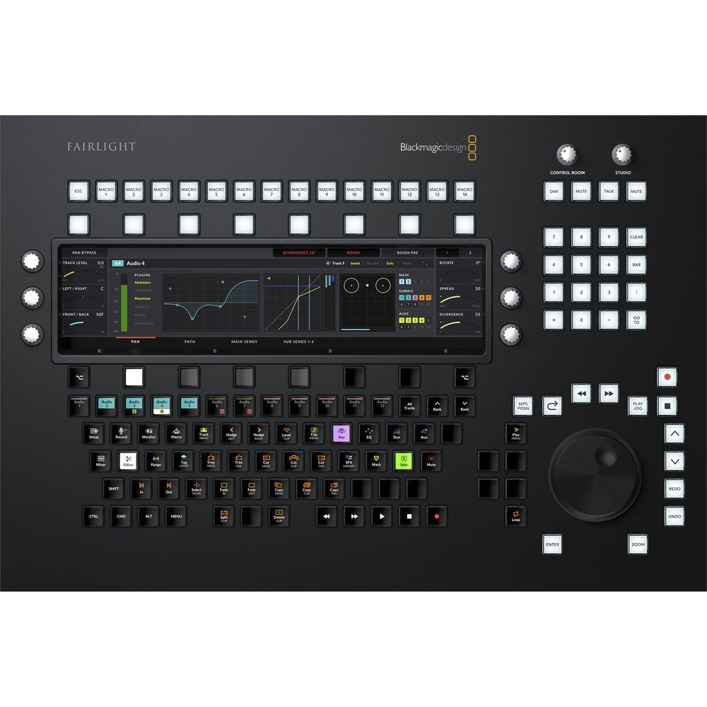 The 12" high-resolution LCD screen follows your lead by automatically switching between five layouts as you execute different tasks, letting you work naturally and see relevant information immediately. Speed of operation is further enhanced by the touch-sensitive control knobs, programmable macro keys, number pad, transport controls, and high-quality search dial. Additionally, the Fairlight Console Audio Editor features a custom keyboard with self-labeling picture keys that change according to what you're doing, allowing the editor to access virtually any function in the Fairlight page.