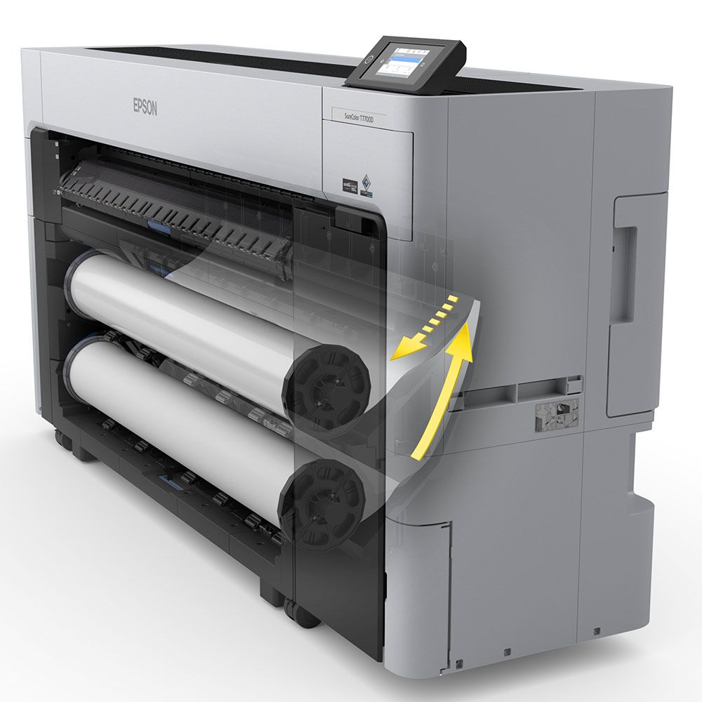 The SC-T5760D has been designed to accept a wide range of roll and single sheet media. It supports stock as light as 80 gsm and has a special straight path for heavy media including board1. It will print borderless and features a high-speed auto-cutter that will cut an A1 sheet in just 2 seconds. Roll media is loaded automatically once placed on the spindle and the printer will automatically change between rolls when one runs out or an alternative type/size is selected. For users who work with a range of media, additional spindles can be ordered and the stock preloaded for rapid interchange. An inbuilt Roll Media Barcode Management system tracks consumption and facilitates automatic re-configuration upon loading. The second roll can be configured as an Auto Take Up for roll to roll production.