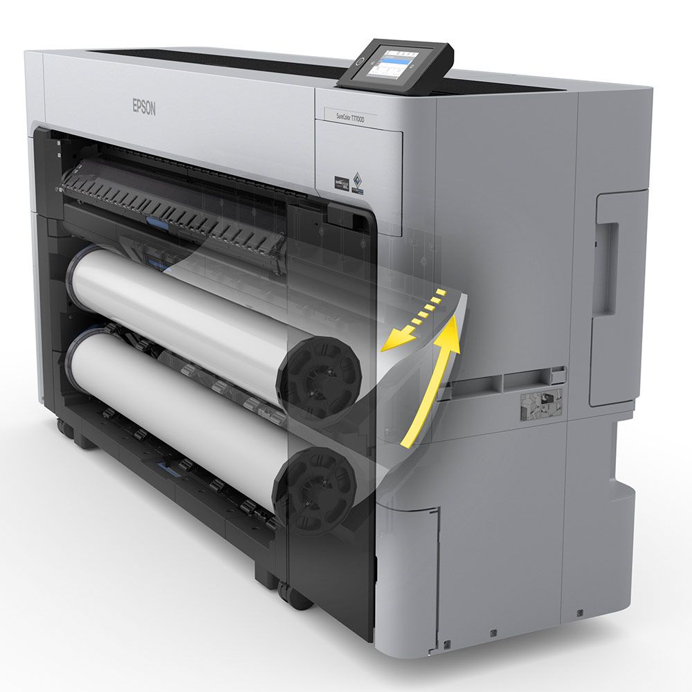 The SC-T5760DM has been designed to accept a wide range of roll and single sheet media. It supports stock as light as 80gsm and has a special straight path for heavy media including board1. It will print borderless and features a high-speed auto-cutter that will cut an A1 sheet in just 2 seconds. Roll media is loaded automatically once placed on the spindle and the printer will automatically change between rolls when one runs out or an alternative type/size is selected. For users who work with a range of media, additional spindles can be ordered and the stock preloaded for rapid interchange. An inbuilt Roll Media Barcode Management system tracks consumption and facilitates automatic re-configuration upon loading. The second roll can be configured as an Auto Take Up for roll to roll production.