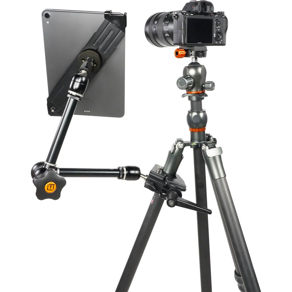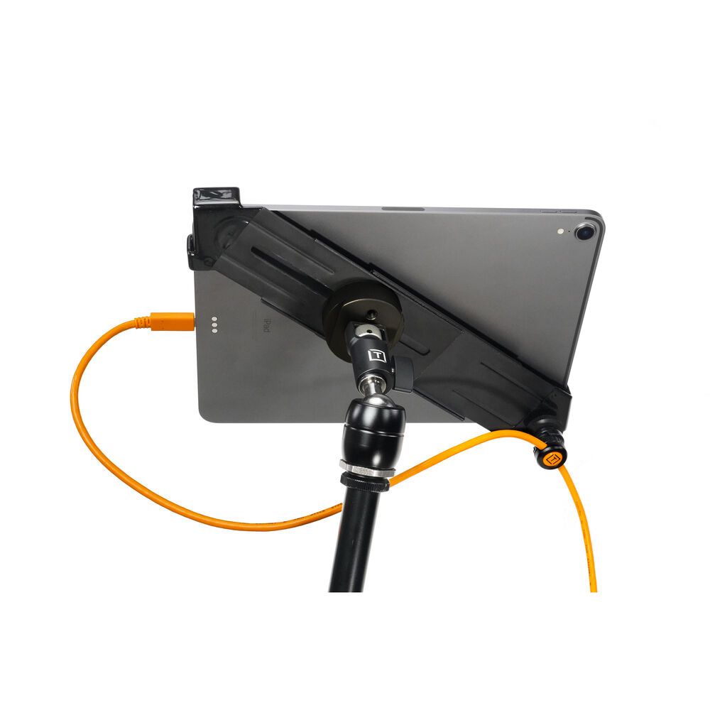 Compatible with iPad mini, iPad Air, iPad, 11" iPad Pro, Surface Go, and similar-sized tablets, the AeroTab Universal Tablet Mounting System from Tether Tools mounts your tablet securely and easily to a tripod, an Arca-style ball head, an articulating arm or clamp, a studio stand, or baby pin mounts. Designed with a secure corner-to-corner diagonal brace, the AeroTab keeps your tablet screen, buttons, front/rear cameras, and ports open and accessible. It supports up to 2kg and extends from 221mm to 355mm.