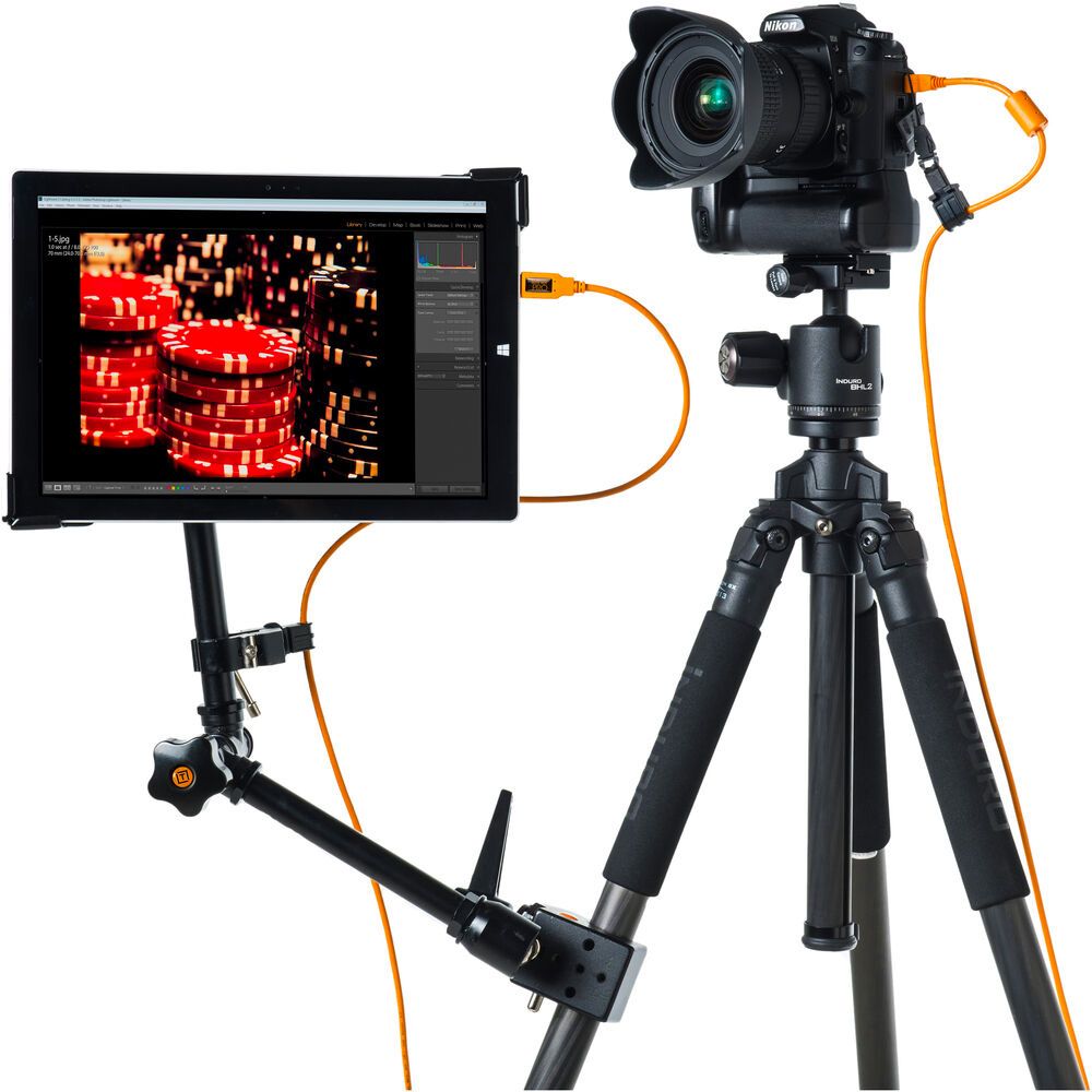 Compatible with 12.9" iPad Pro and larger tablets, the AeroTab Universal Tablet Mounting Systemfrom Tether Tools mounts your tablet securely and easily to a tripod, an Arca-style ball head, an articulating arm or clamp, a studio stand, or baby pin mounts. Designed with a secure corner-to-corner diagonal brace, the AeroTab keeps your tablet screen, buttons, front/rear cameras, and ports open and accessible. It supports up to 2kg and extends from 300mm to 500mm