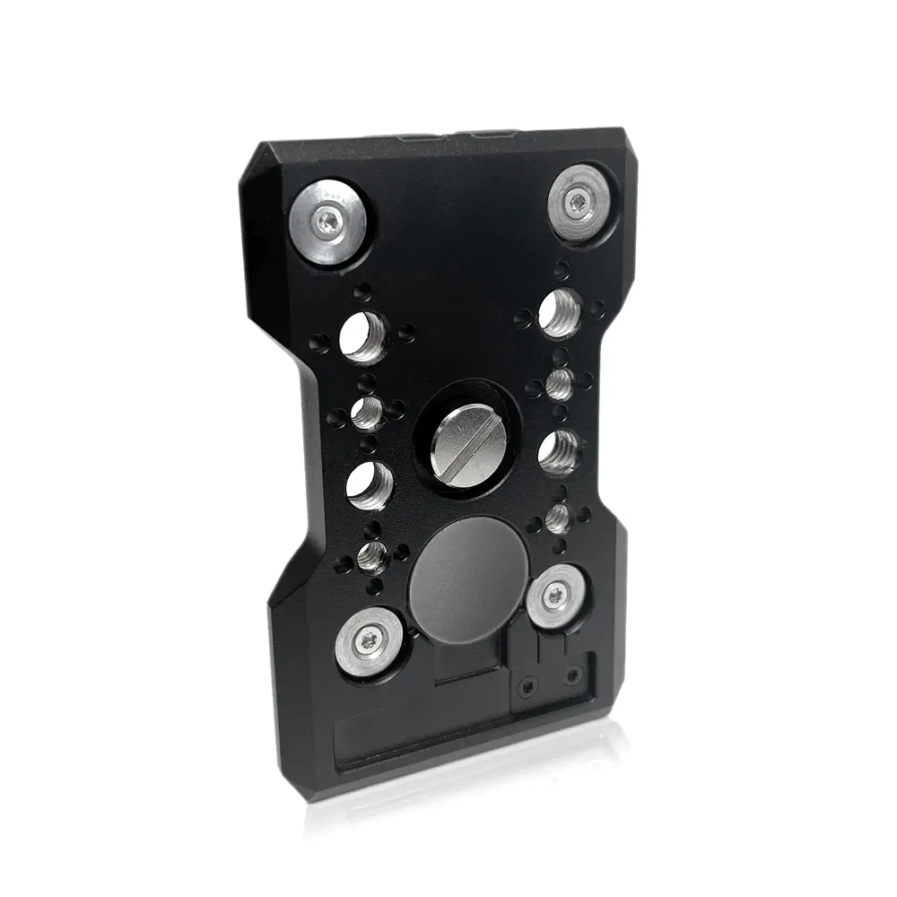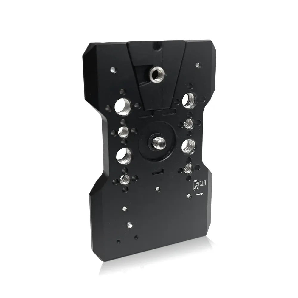 The plate can mount onto a camera, cage, or rig using either a 1/4"-20 center screw or V-lock adapter, and there are additional 1/4"-20 and 3/8"-16 anti-twist threads around the plate for additional mounting options.