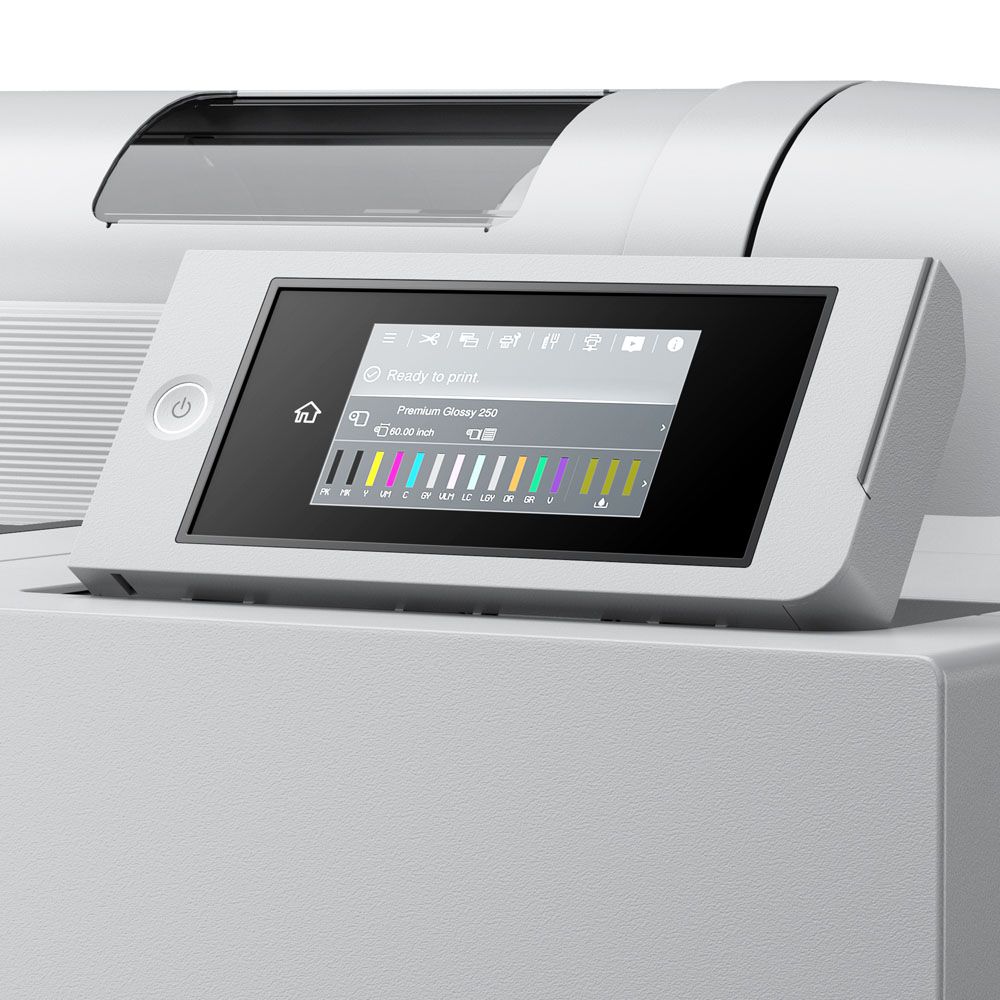 - Easy to Use – 4.3" Colour LCD control panel with integrated help as well as high-visibility individual ink indicator lights. Spindle-based roll media loading with adjustable tension, auto media management system and a heavy-duty auto cutter.