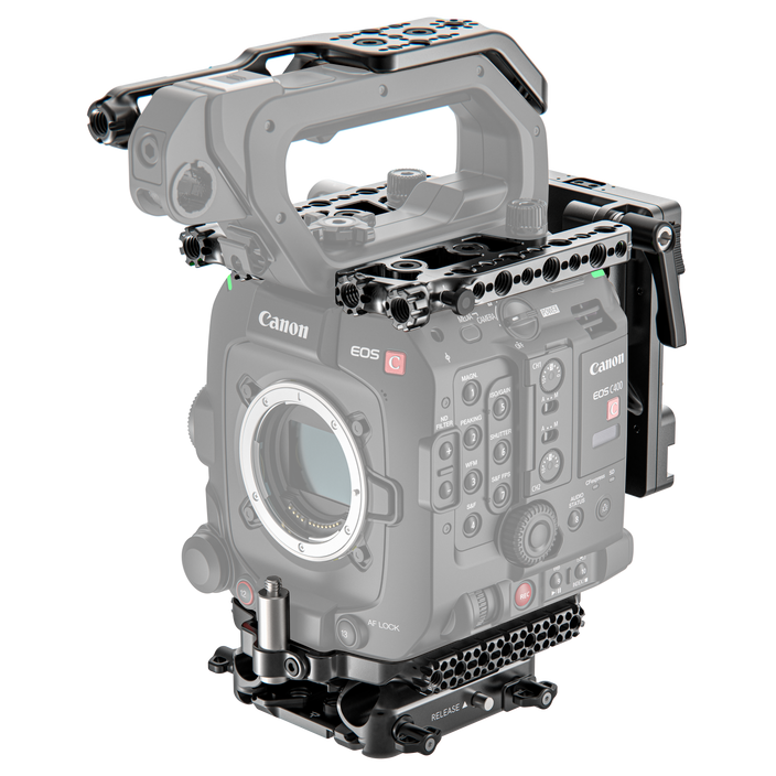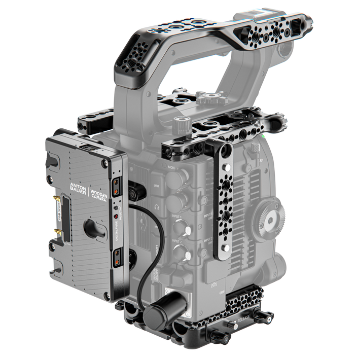 Add all the accessories you need to your Canon EOS C400 cinema camera with this Core Accessory System from Wooden Camera. The modular system includes an Arca-type baseplate with an Arca-type riser system, two versatile left/right top plates, a top handle cheese-style plate, a NATO side rail, and a pro Gold mount battery slide.