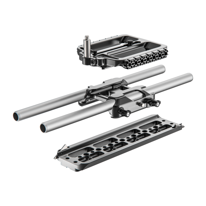 Add all the accessories you need to your Canon EOS C400 cinema camera with this Elite Accessory System from Wooden Camera. The modular system includes an Arca-type baseplate with an Arca-type riser system, a top plate system with two left/right plates and a center plate, an Ultra Handle 5" standard kit, a bolt-on EVF adapter for the Ultra Handle, a NATO side rail, an 8" safety dovetail plate, two 12" long 15mm rods, and a pro V-mount battery slide.