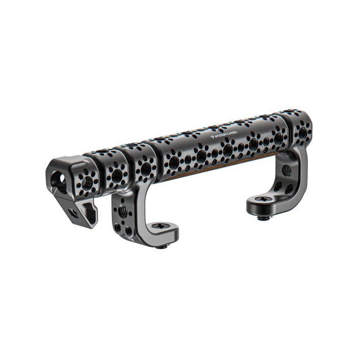 The NATO Side Rail from Wooden Camera attaches to the separately available Canon C400 top plate and provides a NATO rail for accessories such as handgrips. It also features 1/4"-20 and 3/8"-16 mounting threads along the length of the rail for alternative mounting options. The rail can be mounted horizontally or vertically for different configurations, and it features anti-twist safety pins to keep accessories mounted securely.