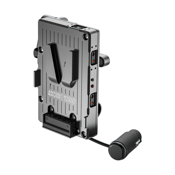 The slide mounts a single V-mount battery and powers the camera using a 4-pin XLR cable, which also provides hot-swap capability with the camera's internal battery. There are three D-Tap outputs around the battery plate to power a variety of other accessories.