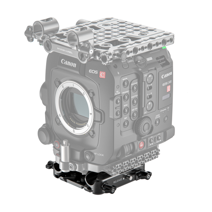 The camera mounts onto a standard or studio dovetail and features 15mm LWS rod ports to accommodate separately available rods. Tie-down screws allow you to adjust the baseplate when mounted onto a dovetail, shoulder rig, or bridge plate. The baseplate requires the separately available riser plate to mount it onto the C400.
