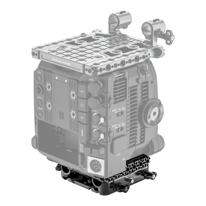 The camera mounts onto a standard or studio dovetail and features 15mm LWS rod ports to accommodate separately available rods. Tie-down screws allow you to adjust the baseplate when mounted onto a dovetail, shoulder rig, or bridge plate. The baseplate requires the separately available riser plate to mount it onto the C400.
