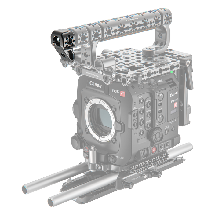 Mount your 15mm EVF adapter for the Canon C400 onto your Ultra Handle rig with this Bolt-On Canon EVF Adapter for Ultra Handle from Wooden Camera. The adapter mounts onto the Ultra Handle front riser or the 1" Ultra Handle extension, part of the Ultra Handle 5" kit. There are two 3/8"-16 threads to mount extensions, as well as the Canon EVF mount. It mounts using a 3/8"-16 screw.