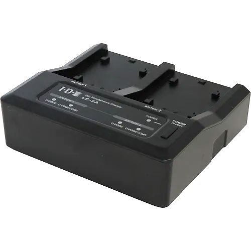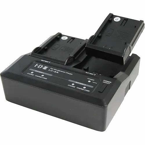 IDX LC-2A battery charger, designed with interchangeable battery interface plates, the 2-Channel LC-2A can simultaneously charge a wide range of 7.4V Canon, Panasonic, and Sony batteries.