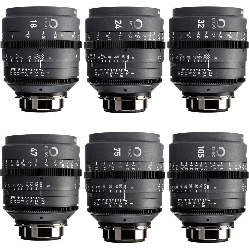 Designed with a compact, lightweight form factor capable of producing reliable images in most environments, the Enso Prime Core 6-Lens Set from ARRI outfits you with six ARRI LPL-mount lenses with lens markings in feet for versatile applications. The set includes 18, 24, 32, 47, 75, and 105mm focal lengths, which share a T2.1 aperture and 95mm front diameter for easy swapping without requiring extensive fiddling with your settings. A 1:4 magnification ratio allows the lenses to have extremely close minimum focus distances while retaining minimum focus breathing. These focal lengths cover a wide range of applications, from product imagery to interviews.