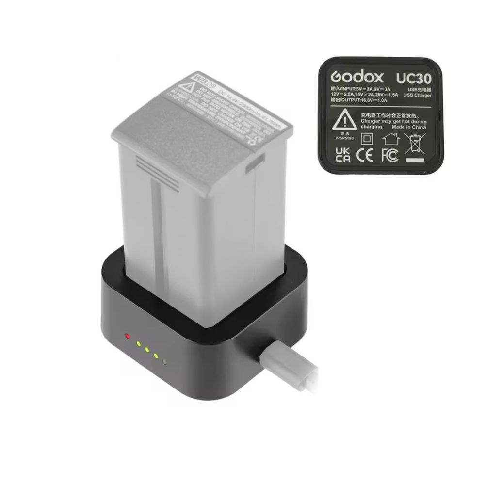 The Godox UC30 USB-C PD Battery Charger is designed and made to charge Godox WB29B , WB30P , WB300P batteries.