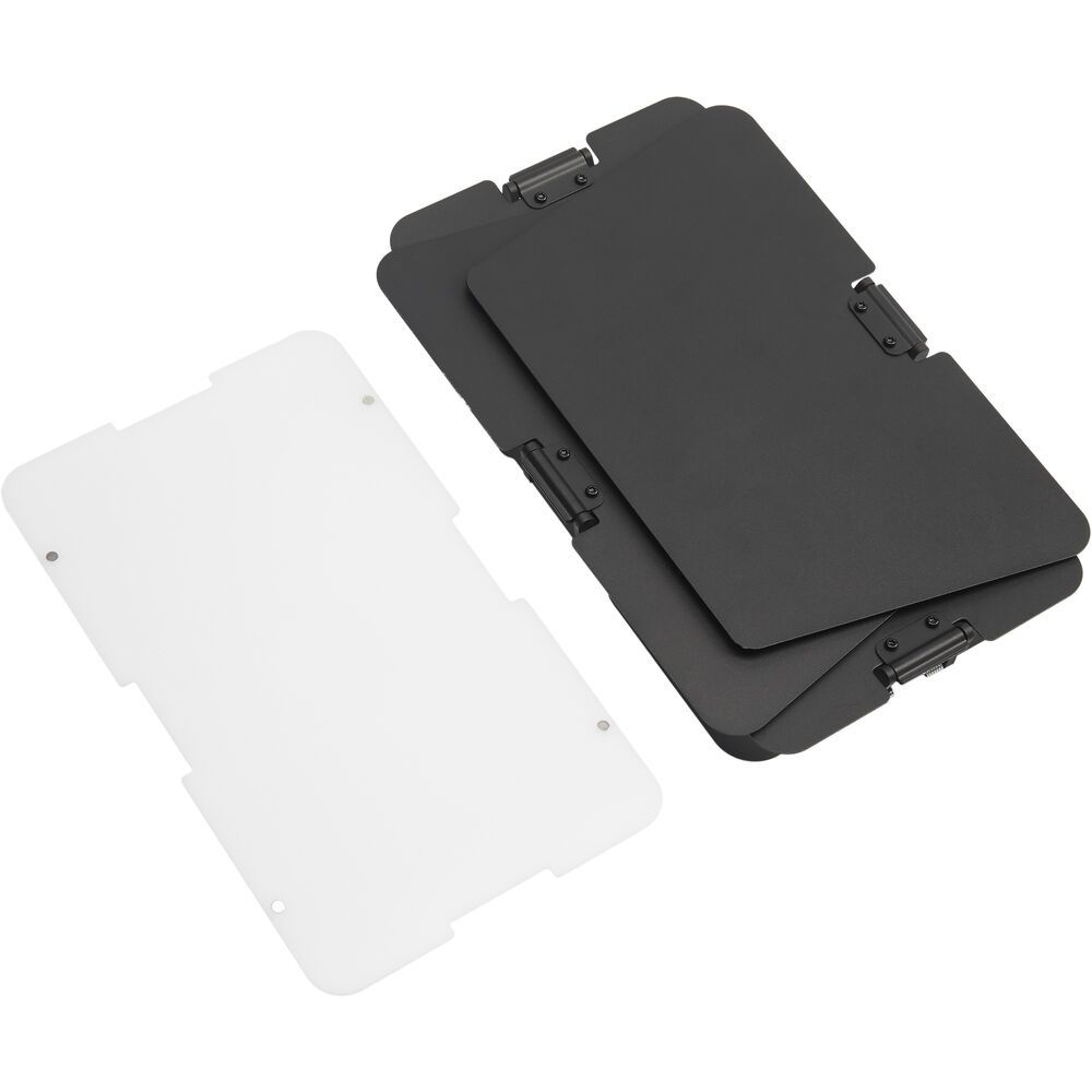 The Barndoors from amaran are a lighting accessory for Pano 60c light panels to shape and sculpt light. To install, leave the barndoors closed and place them facing downwards on a flat surface. Attach the barndoors to the fixture using wired clasps that connect to the light's heat dissipation holes.