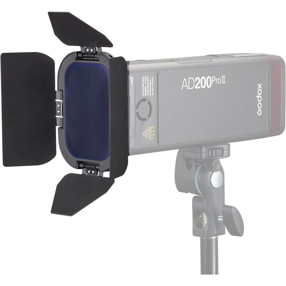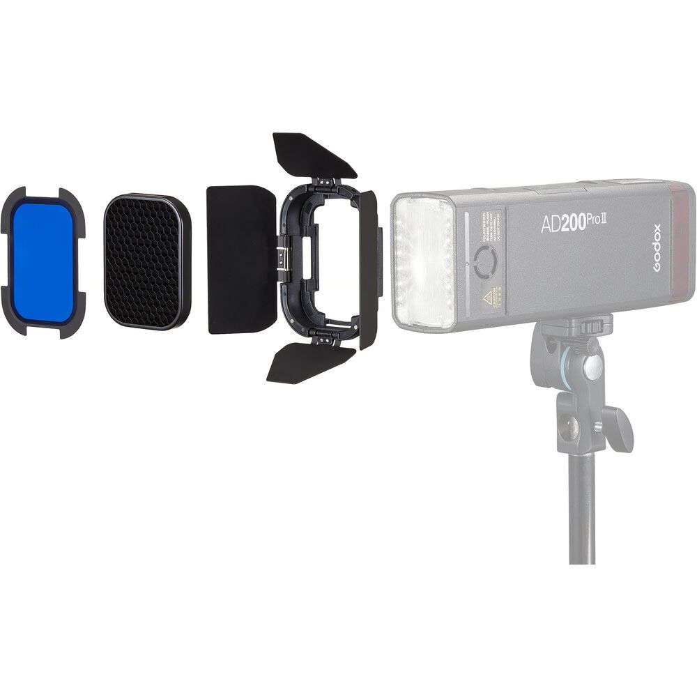 Versatile and compact, this Barndoor Kit from Godox is designed for the AD200Pro II TTL pocket flash. This lighting accessory kit includes 4-leaf barndoors, a grid, and four color filters to sculpt and control light. Use the red, yellow, green, and blue filters to add bursts of color to portraits and product photography shoots. This kit is also compatible with the H200 II flash head.