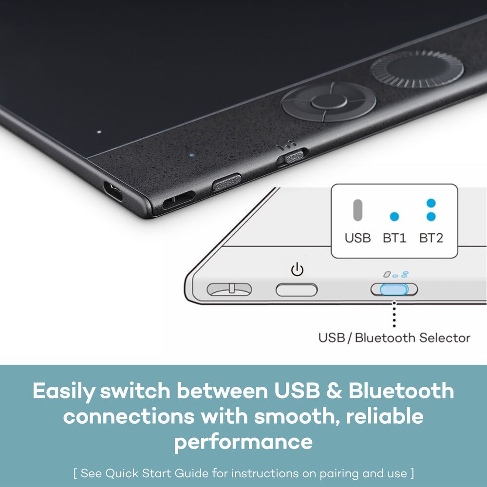 The tablet's 187 x 105 mm active area has a 16:9 aspect ratio that makes it easier to match movements with complementary monitors. With Bluetooth 5.3 support, you have the freedom to place the Intuos Pro almost anywhere and rotate it as needed without getting tangled up. Or you can connect the Intuos Pro directly to your Windows 10 or macOS 13 or later computer with the included USB-C to USB-A cable to recharge the internal 1200mAh battery while you work. Customizable ExpressKeys and radial dial help to accelerate your creative workflow.