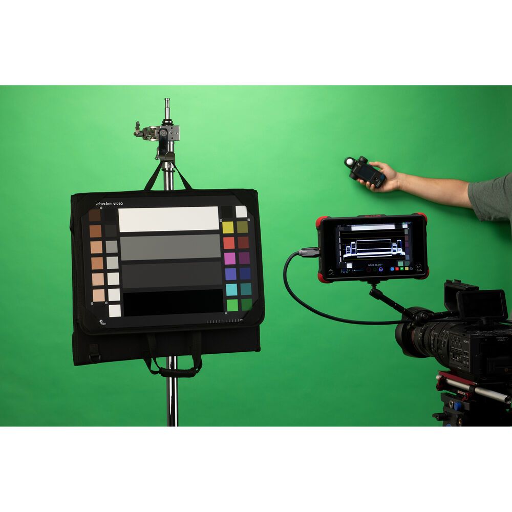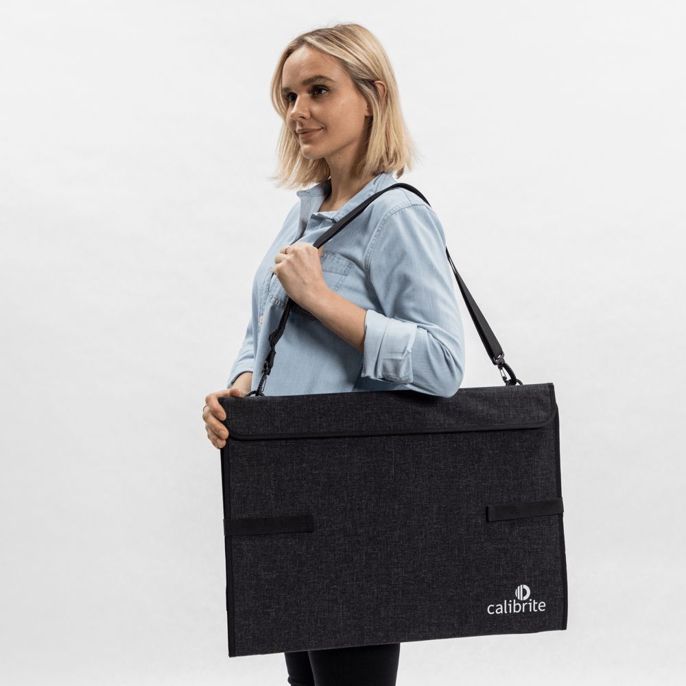 The ColorChecker Video XL with Case is the same 23 x 19.5 x 2.625” (58.42 x 49.53 x 6.67 cm) target with a protective case to keep the target safe during travel and a shoulder length carry strap. The case is made of durable black polyester with a soft tricot interior and is configurable to a self-standing position or lies flat to situate the target for any scene. An elastic strap in each corner keeps the target secure, and a zippered back pocket offers additional storage.