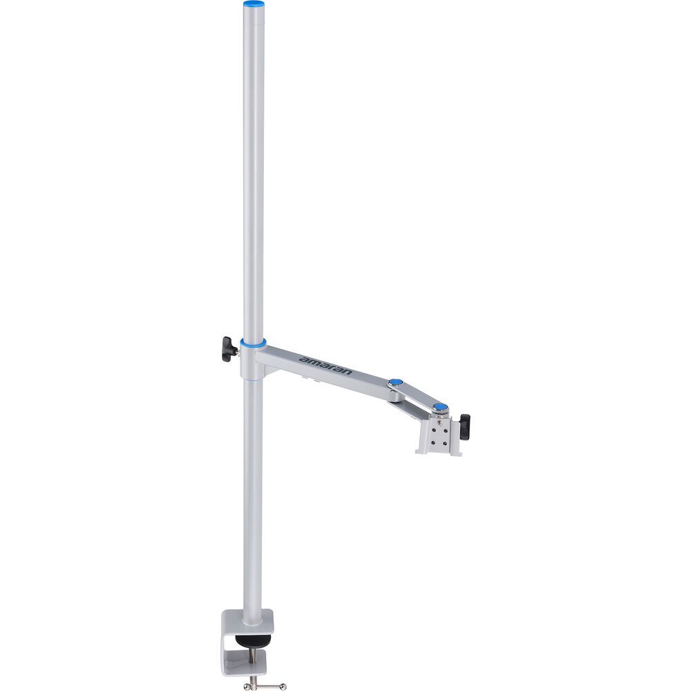 Perfect for desktop setups, this silver Desk Clamp Stand from amaran is a versatile, easy way to mount the brand's separately available Verge or Verge Max LED panels. It features two center columns and a side arm for mounting a single light with precision. The stand's clamp easily mounts onto any table or desk up to 69mm thick to ensure compatibility with most desks. This aluminum-constructed stand is part of amaran's Verge Lock mounting ecosystem to ensure quick locking, as well as a better organized space-saving workspace. Achieve a maximum height of 1m with smooth and flexible positioning for overhead lighting, product shots, and other setups. The stand is combined with a convenient 360° swing arm with 180° pan and tilt control, so you can position your light exactly where needed.
