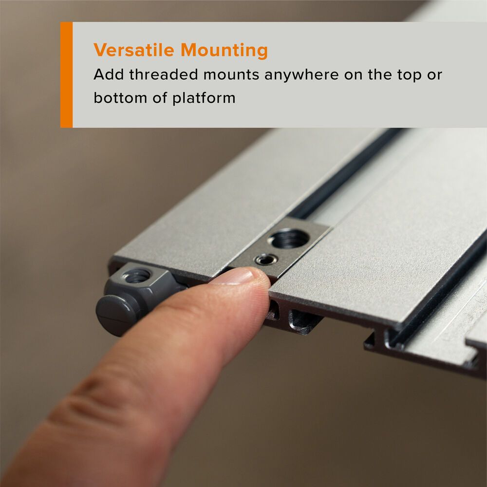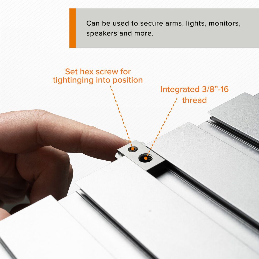 Designed to expand the utility of your workstation, the AeroTrac 3/8"-16 Accessory Threads allows for the secure mounting of arms, monitors, speakers, and other heavy-duty gear to your AeroTrac workstation. These threads may be positioned along the top of bottom of the track, allowing for a more personalised layout. Built using aluminium alloy, protection is provided by a limited lifetime warranty.