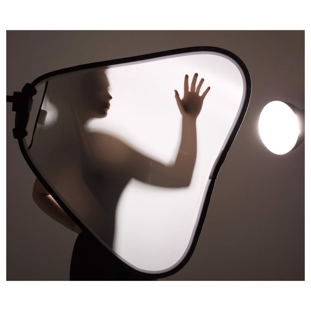 Large TriGrip diffuser for shots that require full body illumination with diffused light. Replacing the need for a regular shaped diffuser the TriGrip diffusers utilise a triangular design which provides a much stronger and more stable structure. They also feature a moulded handle with securing strap, allowing accurate positioning with one hand. This means light can be diffused into awkward spots that would've previously required a stand system. The securing strap also allows you to support the reflector without actually gripping the handle, reducing pressure on your wrist and fingers when held for a long time.