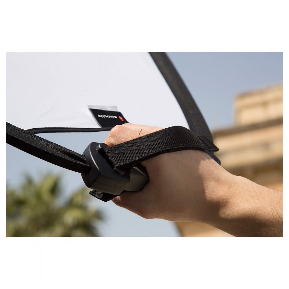 Large TriGrip diffuser for shots that require full body illumination with diffused light. Replacing the need for a regular shaped diffuser the TriGrip diffusers utilise a triangular design which provides a much stronger and more stable structure. They also feature a moulded handle with securing strap, allowing accurate positioning with one hand. This means light can be diffused into awkward spots that would've previously required a stand system. The securing strap also allows you to support the reflector without actually gripping the handle, reducing pressure on your wrist and fingers when held for a long time.
