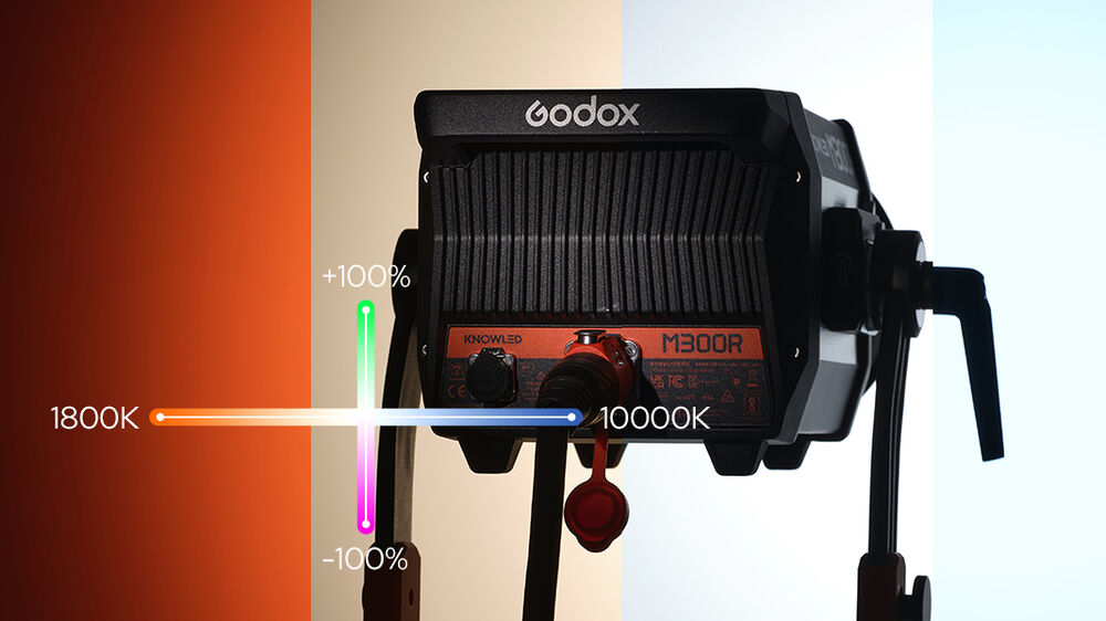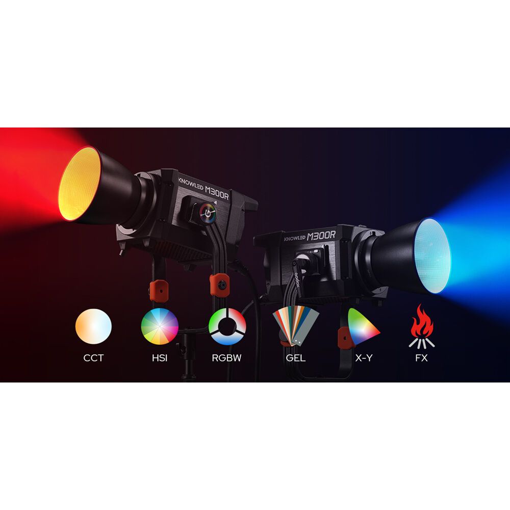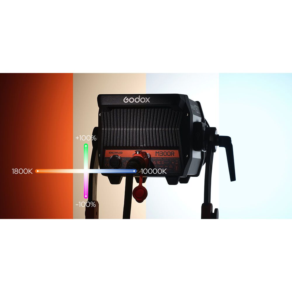 Take advantage of a full RGB fixture with a variety of control and power options with the KNOWLED M300R RGB LED Monolight from Godox. The M300R is part of the brand's KNOWLED professional system that offers powerful lighting and advanced features carefully crafted to satisfy film, TV, and broadcast setups. Experience RGB lighting with complete control over its operation and a wide color temperature range of 1800 to 10,000K. Capable of creating a colorful RGB spectrum, the M300R also boasts high output with 460W of power. The light body and controller box were designed with an IP65 rating to handle the most demanding production sets. This version includes a carry bag for convenient storage and transportation.