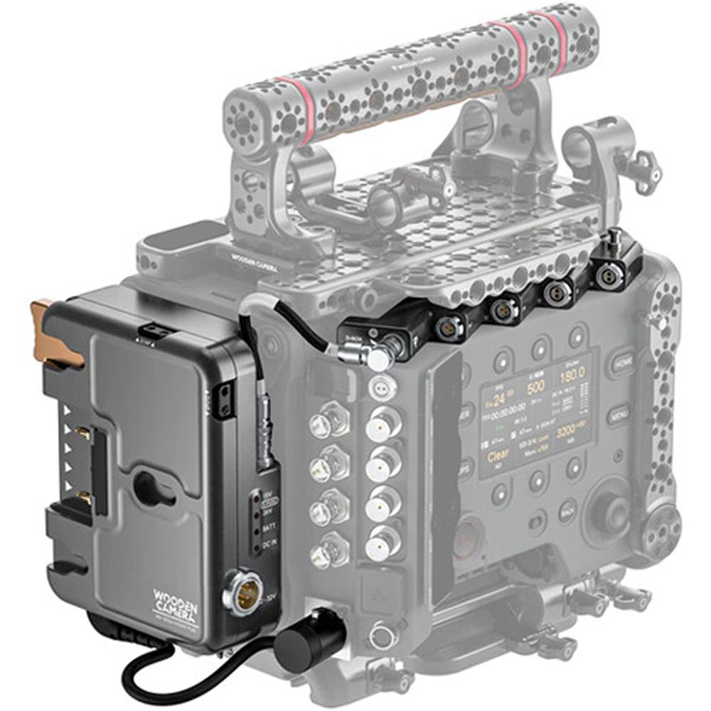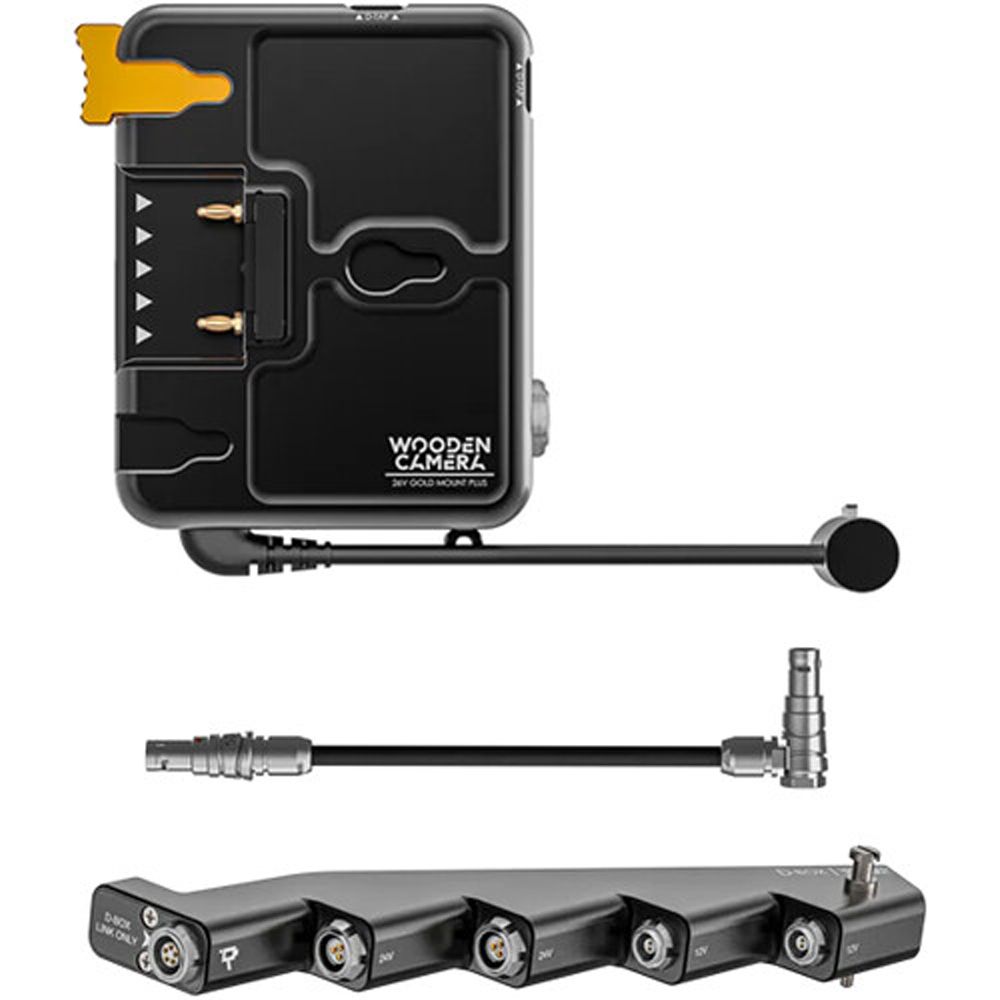 Expand the power and run/stop options of your cinema camera with the Gold Mount Plus D-Box System Sony for VENICE/VENICE 2 from Wooden Camera. This system bundle includes a Gold Mount Plus D-Box power distribution unit, a power output strip, and a cable to link the two.