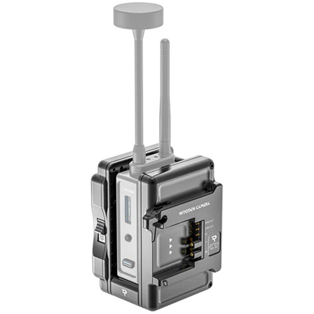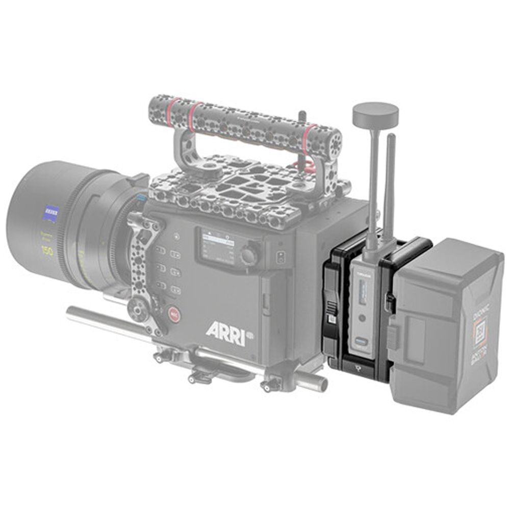 The cradle supports variable 10.3 to 33.6V input with a maximum of 20A load to power heavy-duty cameras such as ARRI cinema cameras with a high-capacity 14 or 26V battery. A captive 1/4"-20 screw on the bottom of the cradle secures the transmitter inside. The cradle helps keep your camera's gear configuration compact, and its open design helps maintain consistent airflow to the transmitter.