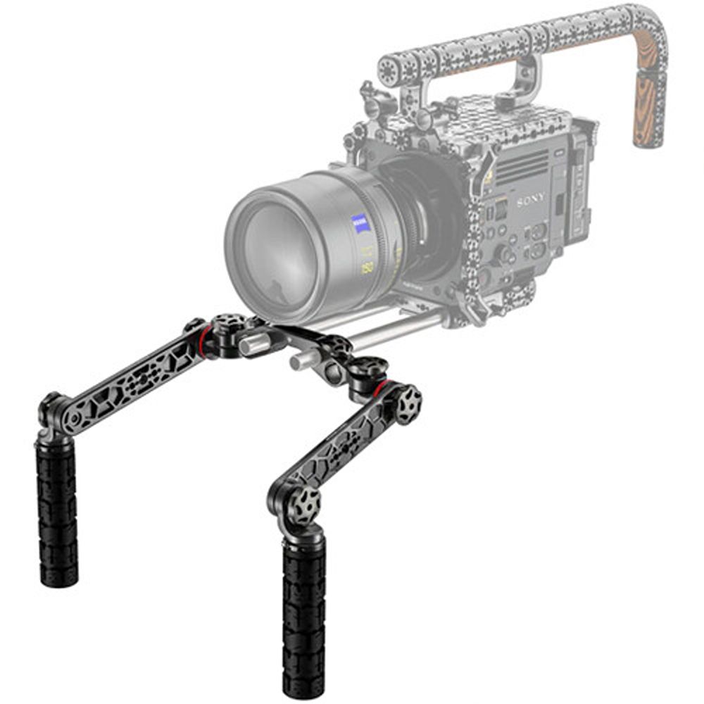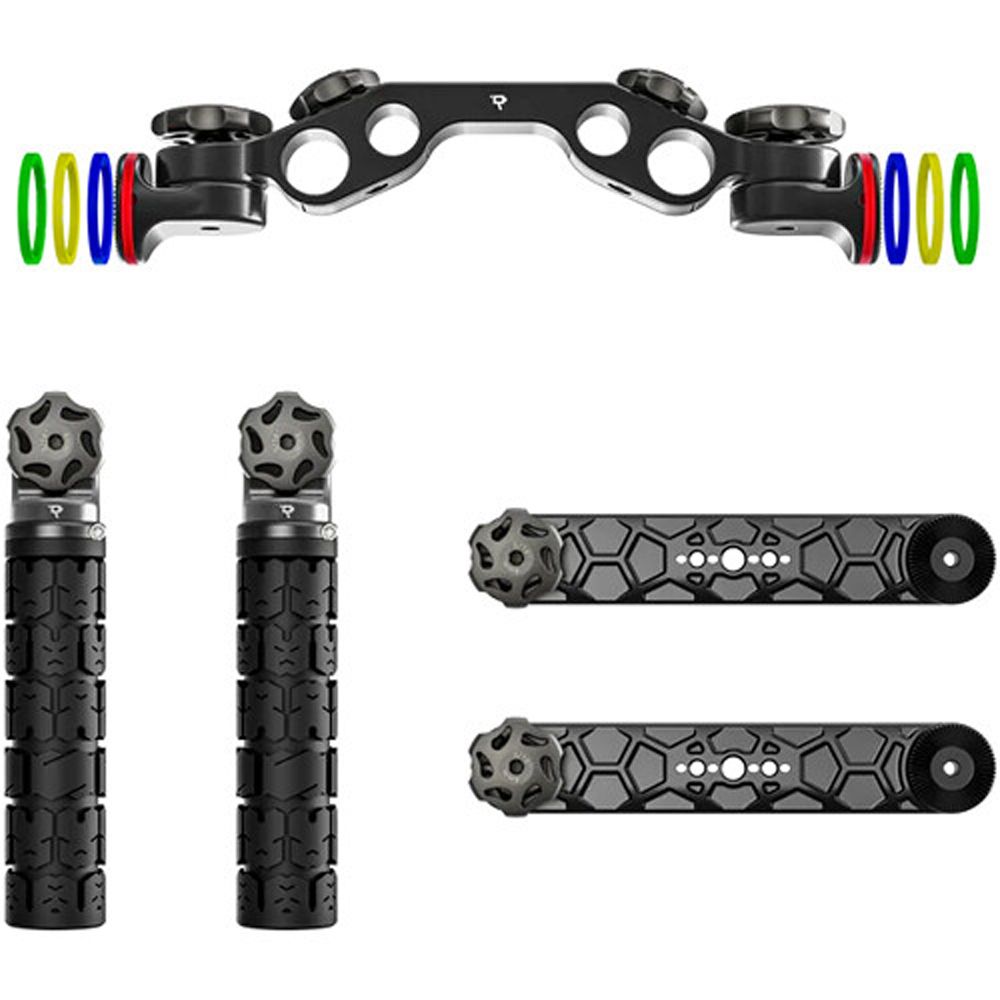 The crossbar is compatible with ARRI-standard dovetails and provides rosettes for the extension arms to rotate the handgrips 360° on each end. The extensions feature a 5° offset, so they can be folded down easily. There are also multiple 1/4"-20 and 3/8"-16 threads to add accessories. The handgrips are designed in a BMX style for a solid grip and lightweight feel, and the components are made from durable aluminum. The color rings allow you to differentiate cameras on set.