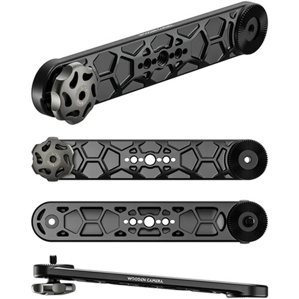 This 4" Extension for Elite Handheld Accessories from Wooden Camera is an essential component that works perfectly with Elite accessories. Constructed from 7075 aluminum, the unit features a pentagonal design and incorporates 1/4"-20 and 3/8"-16 mounting points for broad compatibility with different accessories such as monitors and audio recording devices. Two integrated 32mm rosettes with M6 screw compatibility facilitate the mounting of rosette-compatible accessories, while a stainless steel knob coated in DLC (diamond-like carbon) employs finger grooves for quick and easy tightening.