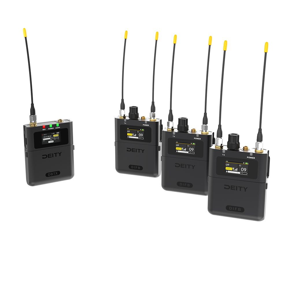 The Deity THEOS DIFB Kit includes 3x DIFB Ultra-Wideband IFB Receivers and 1x DBTX Transmitter. It offers the widest tunable frequency range from 550 MHz to 960 MHz, Global OneBand™ Technology for automatic local frequency compliance via GPS, true diversity reception with dual SMA antenna ports, and up to 17 hours of battery life. The kit is designed for professional broadcast, film, and live event use, featuring easy setup with auto-pairing, a color display, and integration with the SIDUS Audio app for frequency scanning and remote control.
