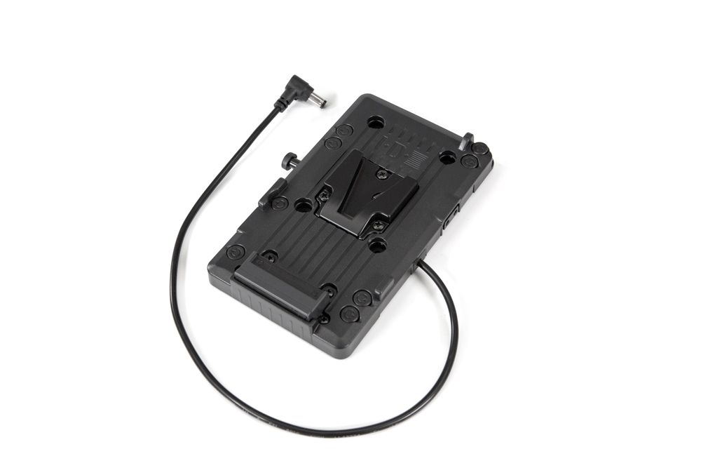 Wooden Camera brand V-Mount plate utilising an IDX V-Mount and Blackmagic Cinema Camera DC connector.