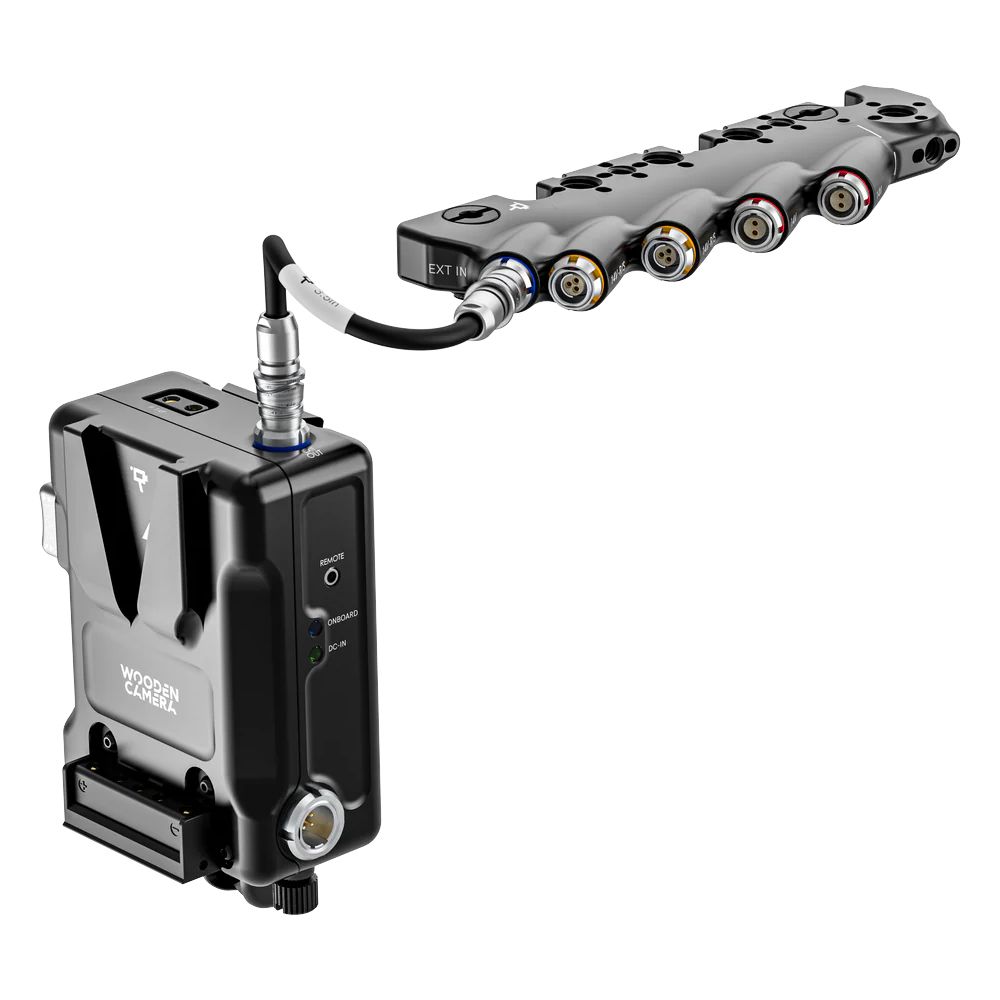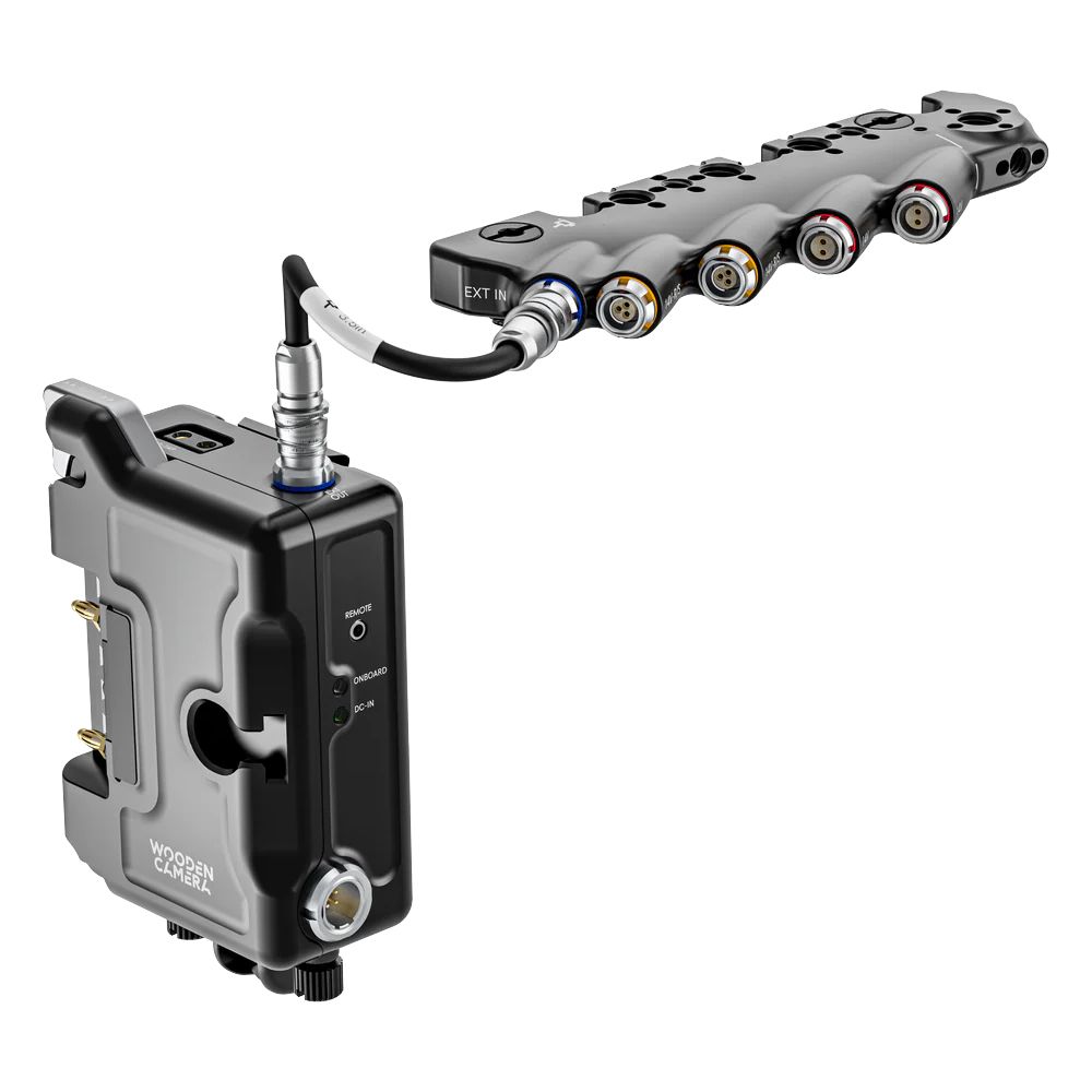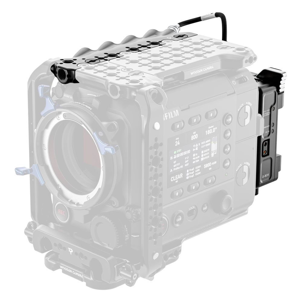 Extend the power output options of your FUJIFILM GFX ETERNA 55 cinema camera with this D-Box System from Wooden Camera. The bundle includes the D-Box power distribution unit with a V-mount battery plate, a support bracket, an extension power strip, a remote cable, and a link cable. The D-Box provides 4-pin DC input, D-Tap, and remote ports to output power for the camera and accessories from a Gold mount battery, as well as distribute trigger control. The unit also supports hot swapping when using the DC input.