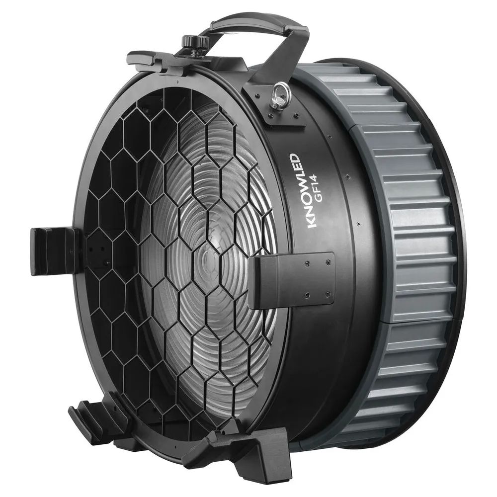 Specifically designed for the KNOWLED MG1200Bi Bi-Colour LED Monolight, the Godox GF14 Fresnel Lens increases the maximum output of the light to 78,800 lux at 3m while also maintaining light quality.