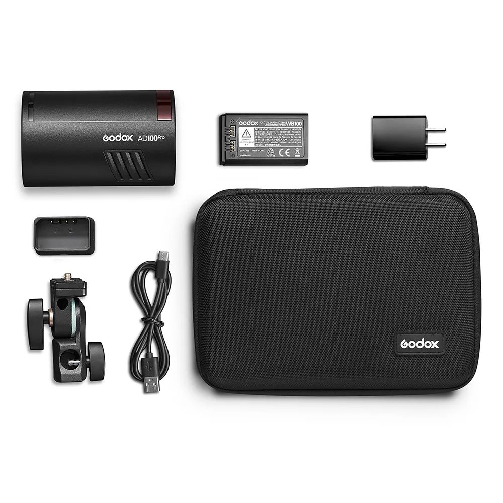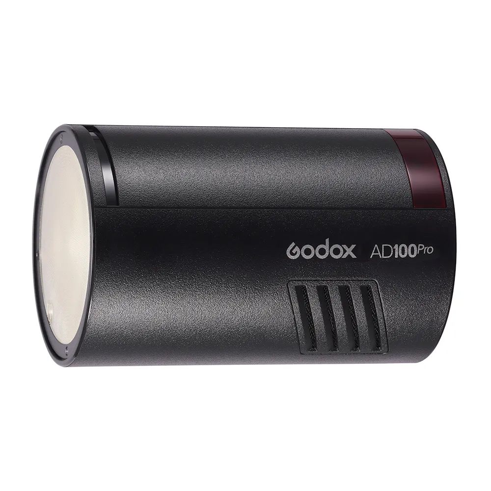The AD100pro has impressive core features such as 100Ws of power adjustable in nine steps from 1/256 to 1/1, recycling times from 0.01 to 1.5 seconds, and short flash durations. The AD100pro has manual, auto, and stroboscopic capability. Manual mode outputs the user's choice of power, modelling light, and first or second curtain sync. Multi-mode controls the stroboscopic rate up to 90 times (90 Hz). Optional wireless transmitters with 32-channel and four groups system control flash mode, first and second curtain sync, High-Speed Sync up to 1/8000 second, power level, and modelling lamp at distances up to 328'. Firmware updates are obtainable on the Godox website.
