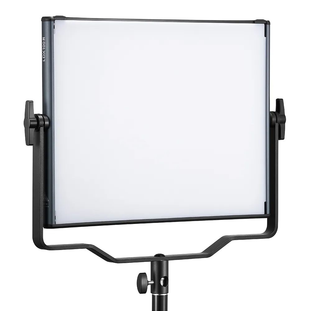 The LDX100R RGB LED Light Panel from Godox is a compact 46 x 40cm fixture with RGBWW capability to enable you to quickly adjust the color temperature from 2500 to 10,000K. The light can be dimmed from 0 to 100% throughout its CCT range, giving you high CRI/TLCI ratings of 96 as indicators of advanced accuracy in color rendering. Furthermore, this panel provides a soft light well suited for video use with 14 special effects to lend realism to your shoot. Adjustments can be made either onboard, remotely through an optional wireless remote control, or via an app directly from your smartphone.