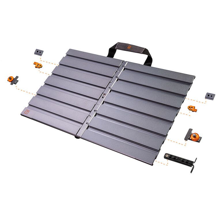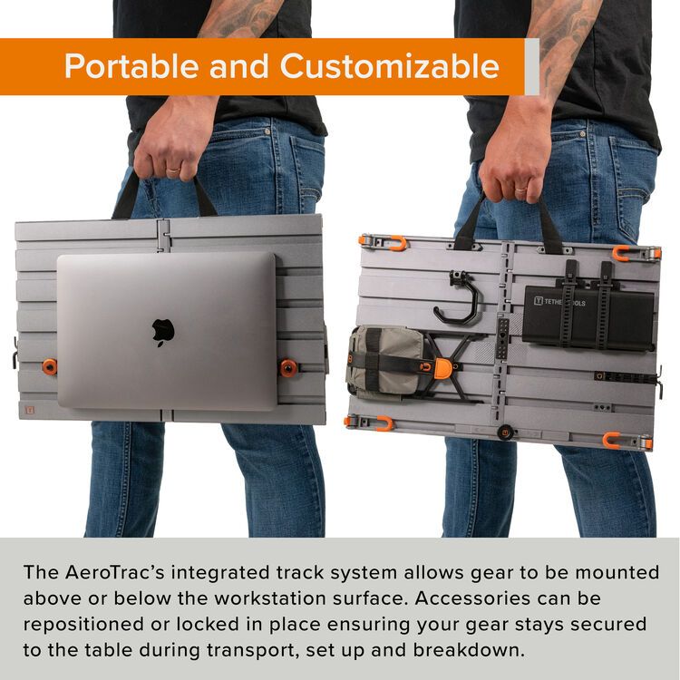 The integrated track system enables seamless accessory attachment—above or below the surface—so you can build a personalized setup that moves with you. Included tech clamps secure your laptop or tablet, movable 1/4”-20 threads integrate extra monitors, lights, speakers and other tools as needed. The lightweight handle ensures easy carrying, and the included Hex Tool makes quick adjustments a breeze. With AeroTrac, your tech stays in place during setup, teardown, and transport—keeping your workflow uninterrupted and your tech, power, storage and tools exactly where you need them.