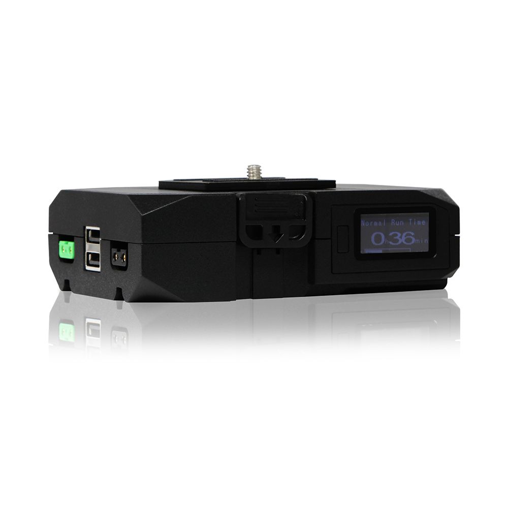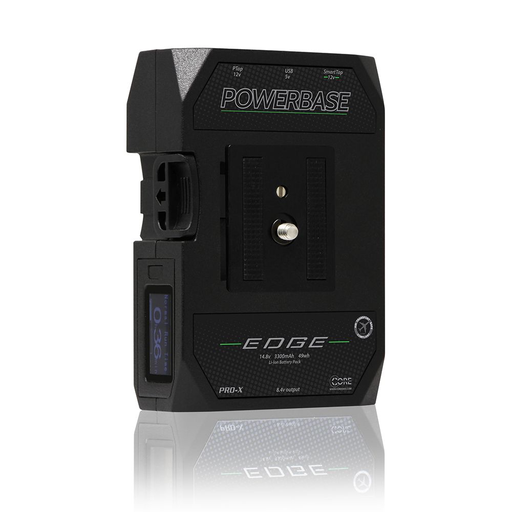 As it is often difficult to approximate runtime when powering the camera as well as multiple devices, the Powerbase Edge has a built-in runtime LCD, to deliver exact battery expectancy to the minute. The LCD also has a button activated backlight to be view-able in any environment. As with it’s predecessor, the Edge has a quick release plate to attach underneath the camera, or quickly attach/detach to a rig or camera cage. It is 30% smaller than the Powerbase 70 yet can still withstand the draw of a full size Cinematic cameras.