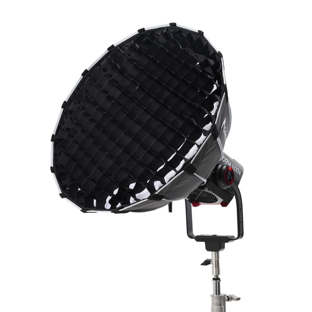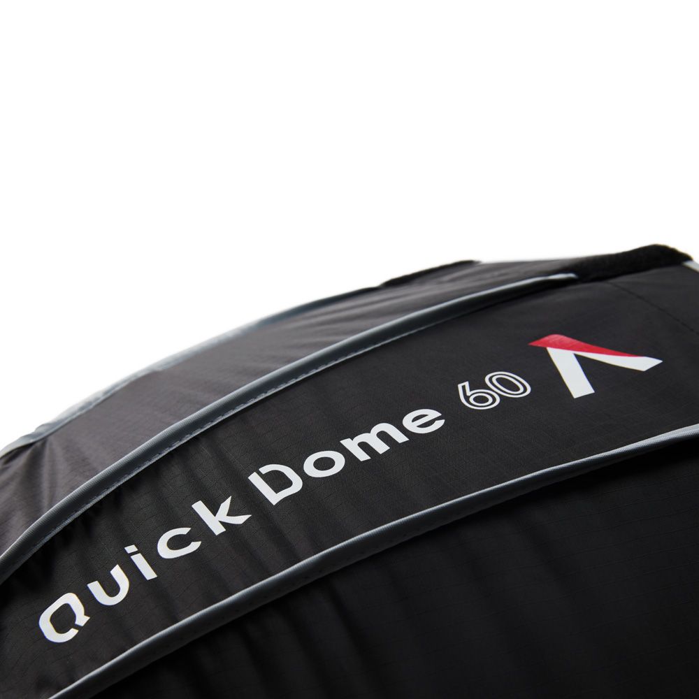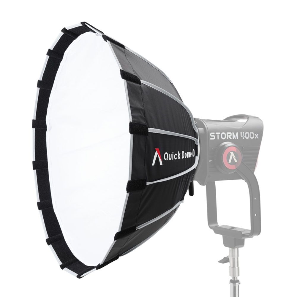 The Quick Dome 60 is a circular Bowens mount softbox featuring a parabolic design that pairs with the STORM, Electro Storm, and Light Storm fixtures. The softbox has a reflective silver interior and provides a soft, even light output.
