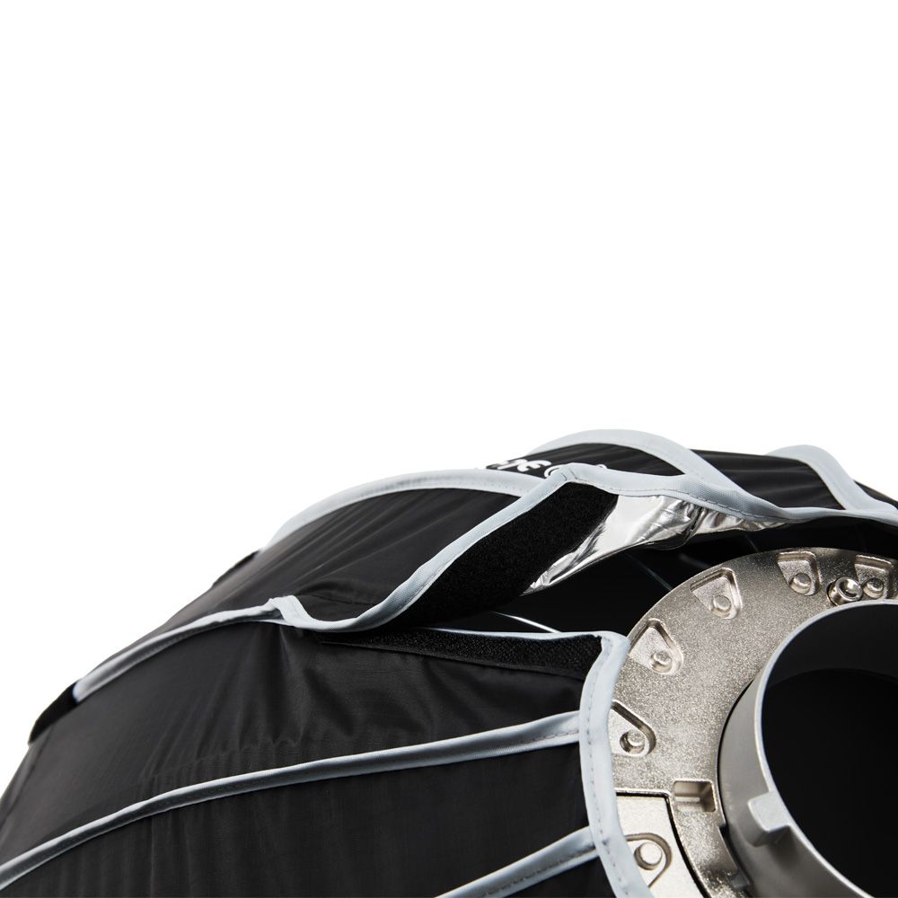 A quick-release latch on the speed ring allows users to quickly set up the tension on all 16 steel support rods in seconds, making installation a breeze. The lateral side handle provides easy mounting setup and control, and comfort when mounting. When not in use, the softbox folds down flat, making it easy to store in the included carry bag.