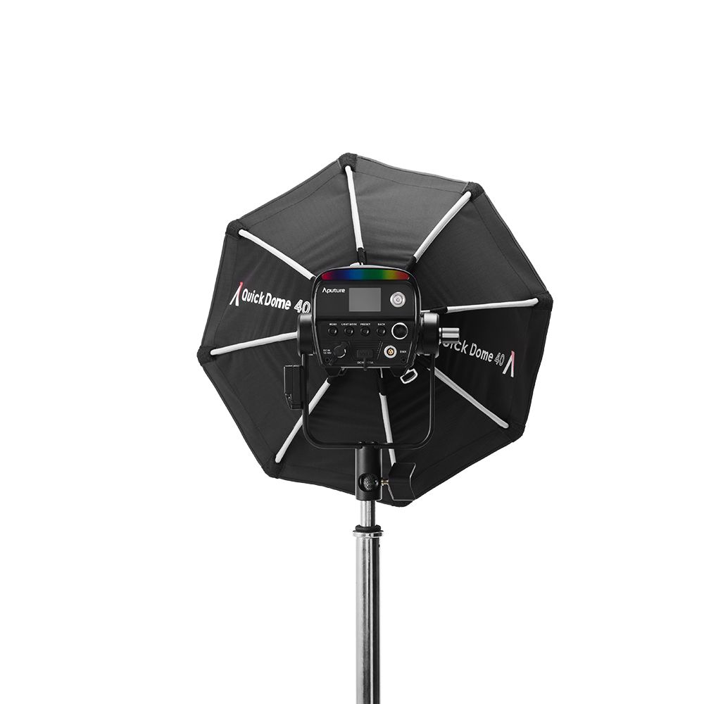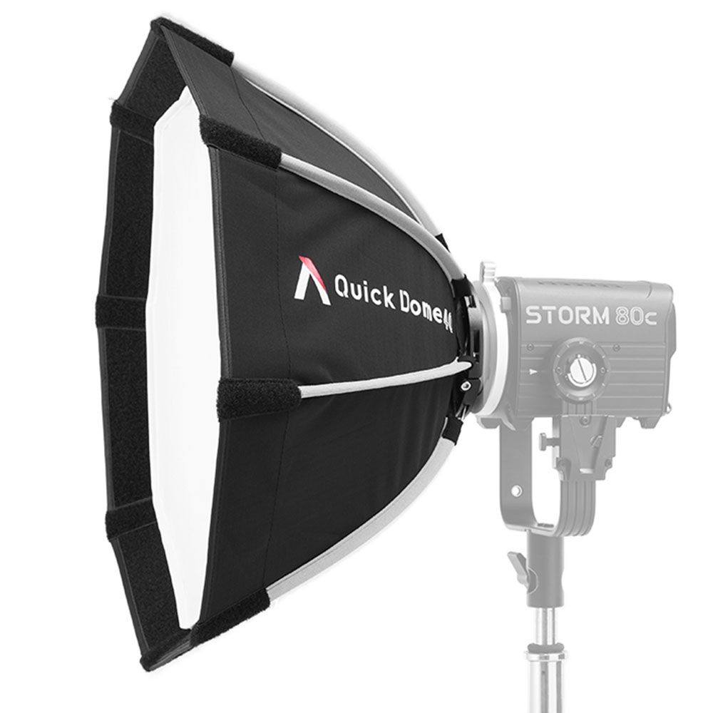 The Quick Dome 40 is a compact circular softbox featuring a parabolic design that is designed to pair with the STORM 80c light fixture. The softbox has a reflective silver interior and provides a soft, even light output.