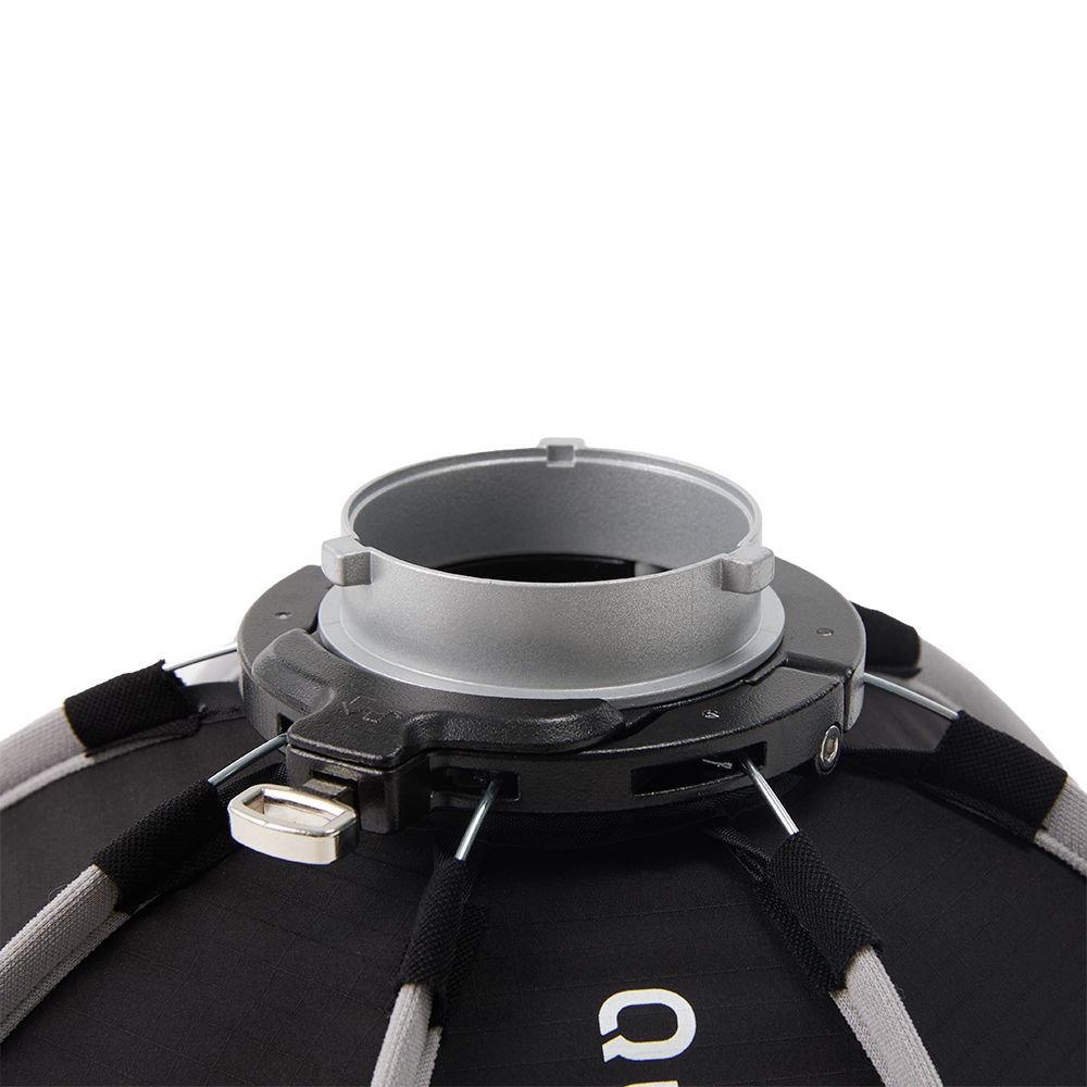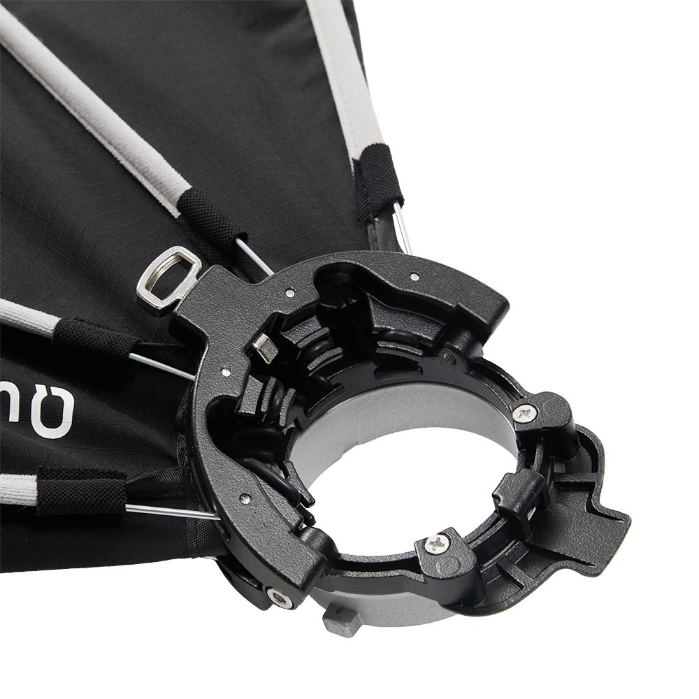A quick-release latch on the Mini ProLock mount allows users to quickly set up the tension on all eight steel support rods in seconds, making installation a breeze. When not in use, the softbox folds down flat for easy storage in the included carry bag.
