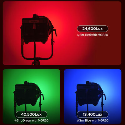 - Combined with the MGR20 reflector, the light delivers impressive values of 24,600 lux (red), 40,500 lux (green), and 13,400 lux (blue) from the same 9.8' distance.