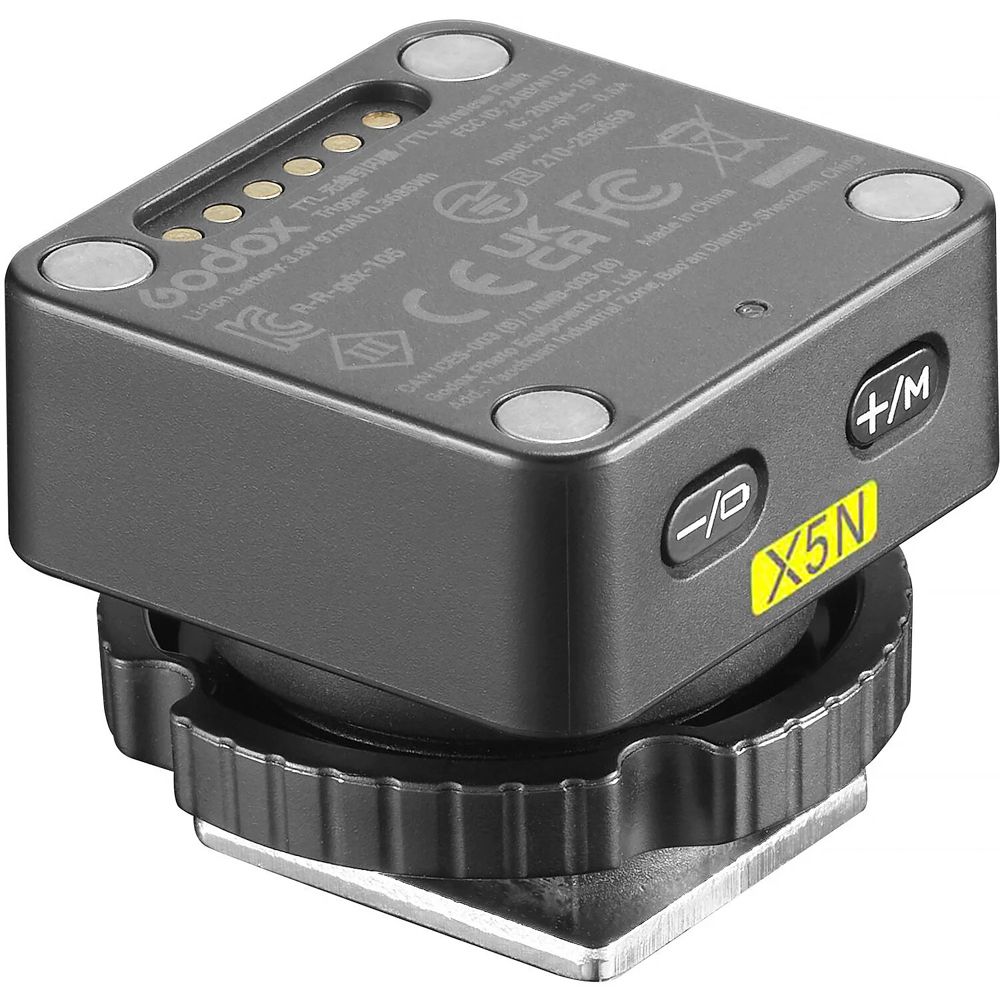 The dynamic X5N TTL Wireless Flash Trigger from Godox works seamlessly with the brand's separately available iT32 mini flash by adding a hot shoe connection and flash triggering capability. This version, the X5N, features a hot shoe compatible with select Nikon cameras. By simply aligning the X5N with the bottom of your iT32, the flash will automatically absorb it for easy attachment. After this step, rotate the locking ring of the flash trigger to properly insert the X5N into the hot shoe mount of your compatible camera. To complete, rotate the locking ring until it's locked for secure connection.