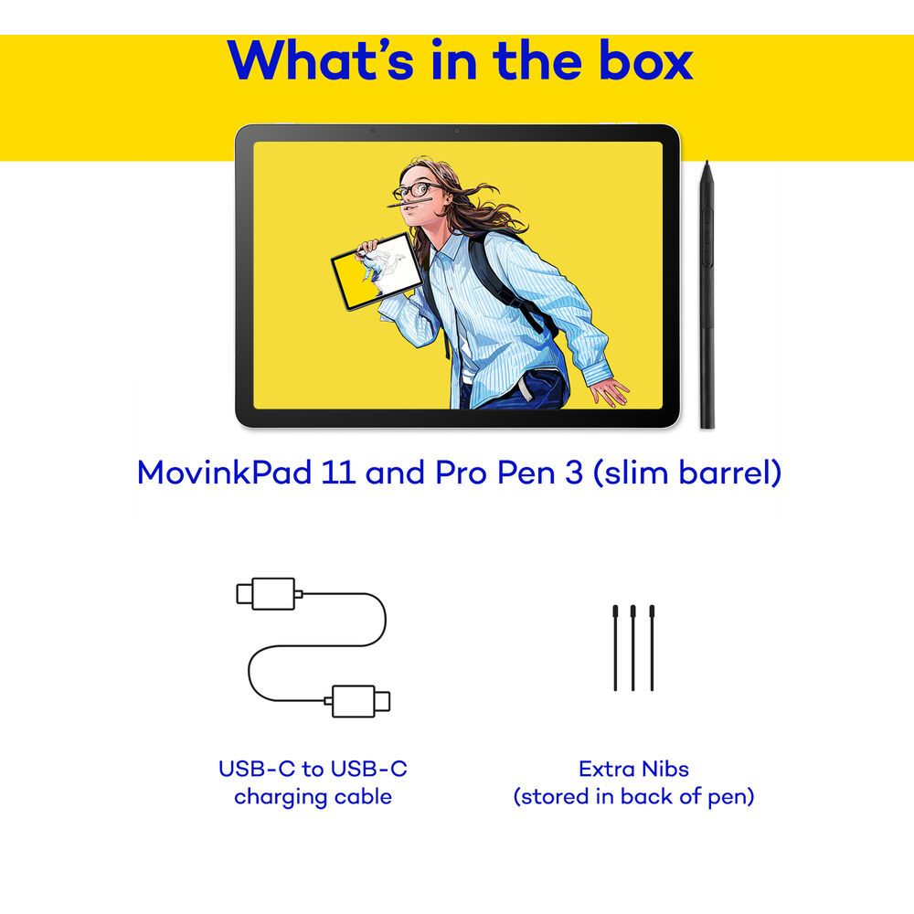 This lightweight all-in-one tablet is powered by a MediaTek G99 processor, 8GB of RAM, and 128GB of storage. It also has Wi-Fi 5 and Bluetooth 5.2 wireless technology, so you can stay connected. The 7,700 mAh lithium ion battery provides up to 9 hours of battery life. There is a 5MP front camera and a 4.7MP rear camera. For charging, you can plug the tablet in via USB-C. The MovinkPad comes preinstalled with the Android 14 operating system.