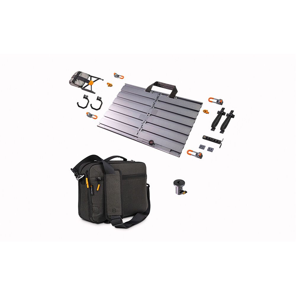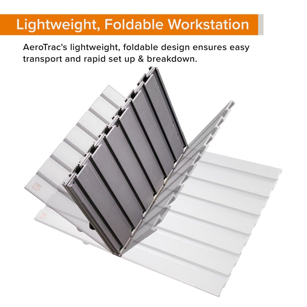 The AeroTrac Workstation Pro Kit by Tether Tools is a foldable and modular workstation plate suitable for use in filmmaking and other creative environments. The 432 x 280 x 9mm workstation folds down to 280 x 216 x 19mm for a quick setup and breakdown. It features integrated cold shoe mounting rails for adding accessories and a magnetic locking system that prevents the plate from accidentally opening while in transit. The kit includes clamps, handles, straps, and hooks for attaching video accessories and equipment. Mount the workstation to most tripods via 1/4"-20 or 3/8"-16 interface, and expand your options further with the included baby ball head adapter. Set up the plate as a standalone station with four included legs. When it's time to travel, the included carrying case makes transportation a breeze. A 30 lb weight capacity secures your gear. Enjoy professional performance from an anodized aluminum construction.