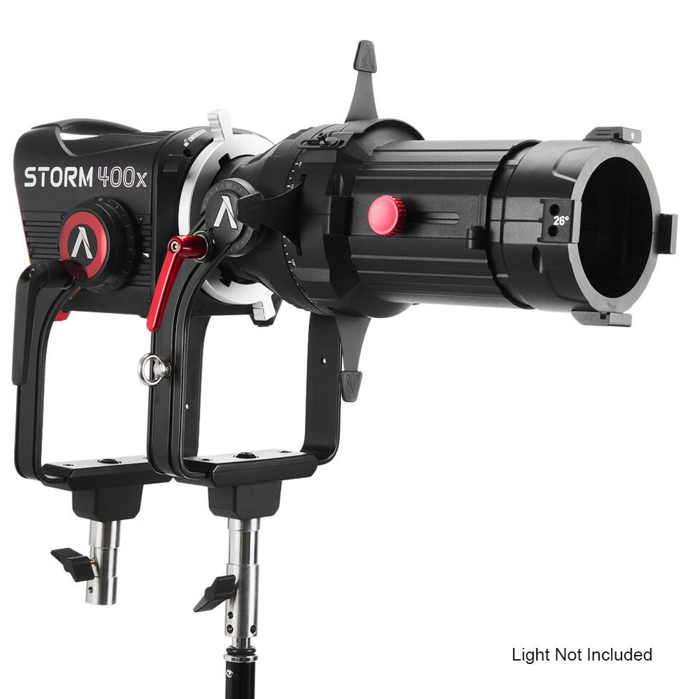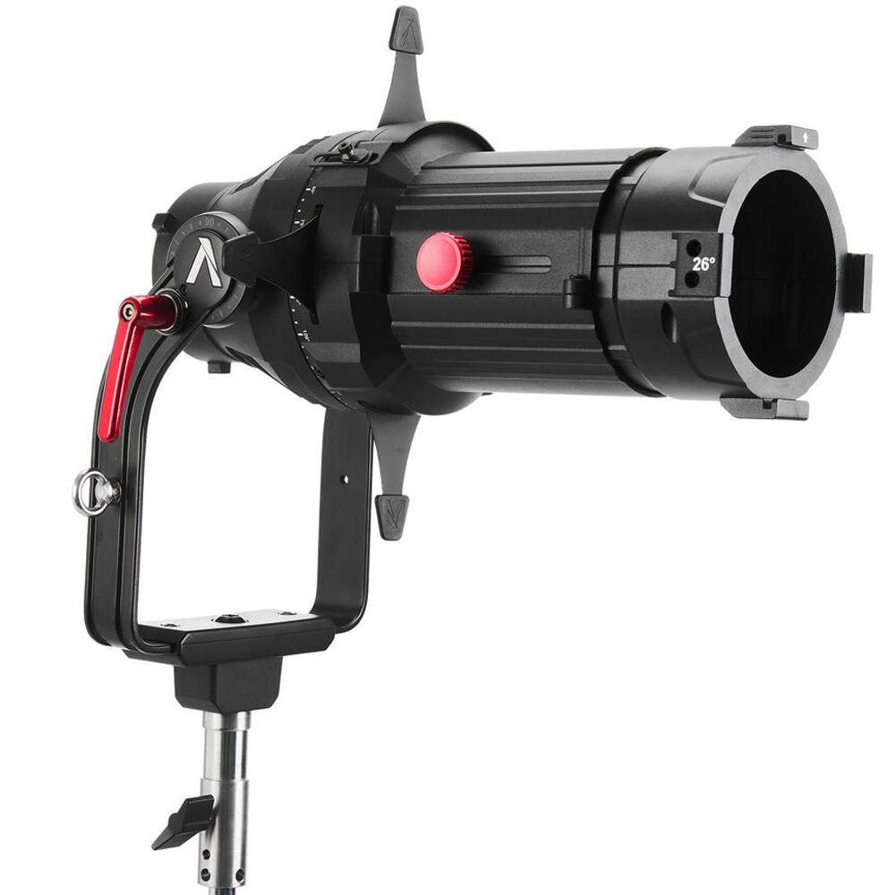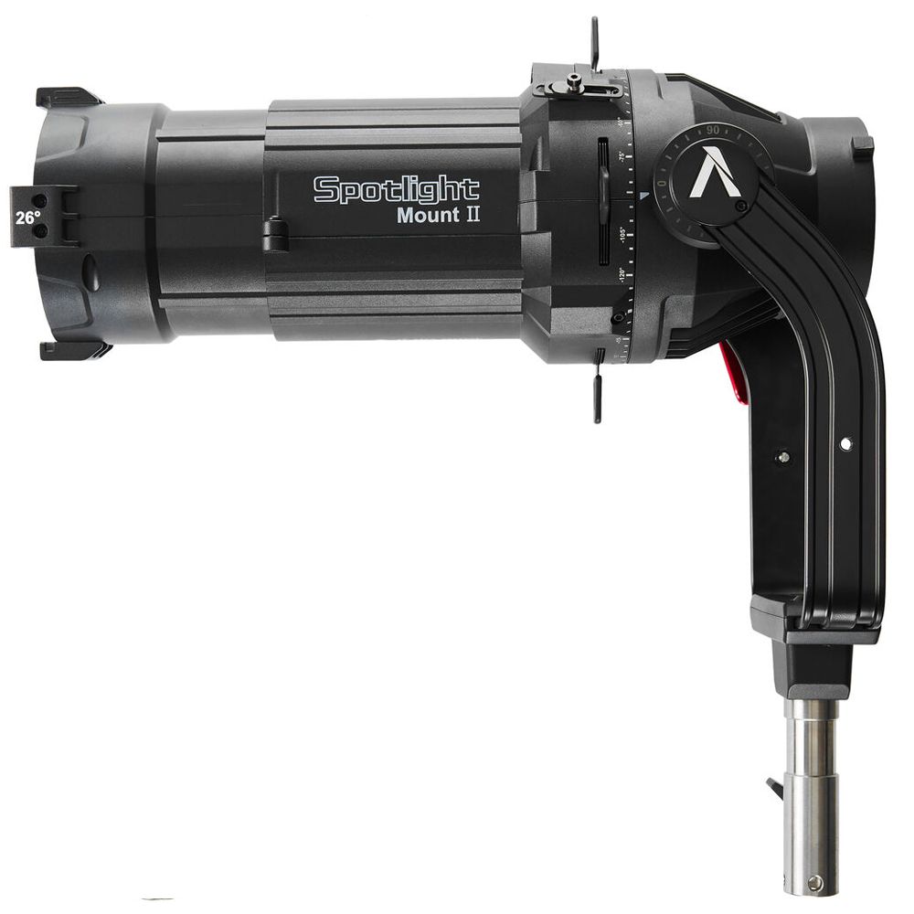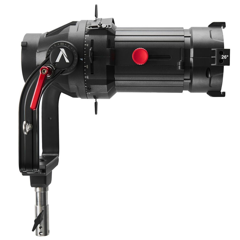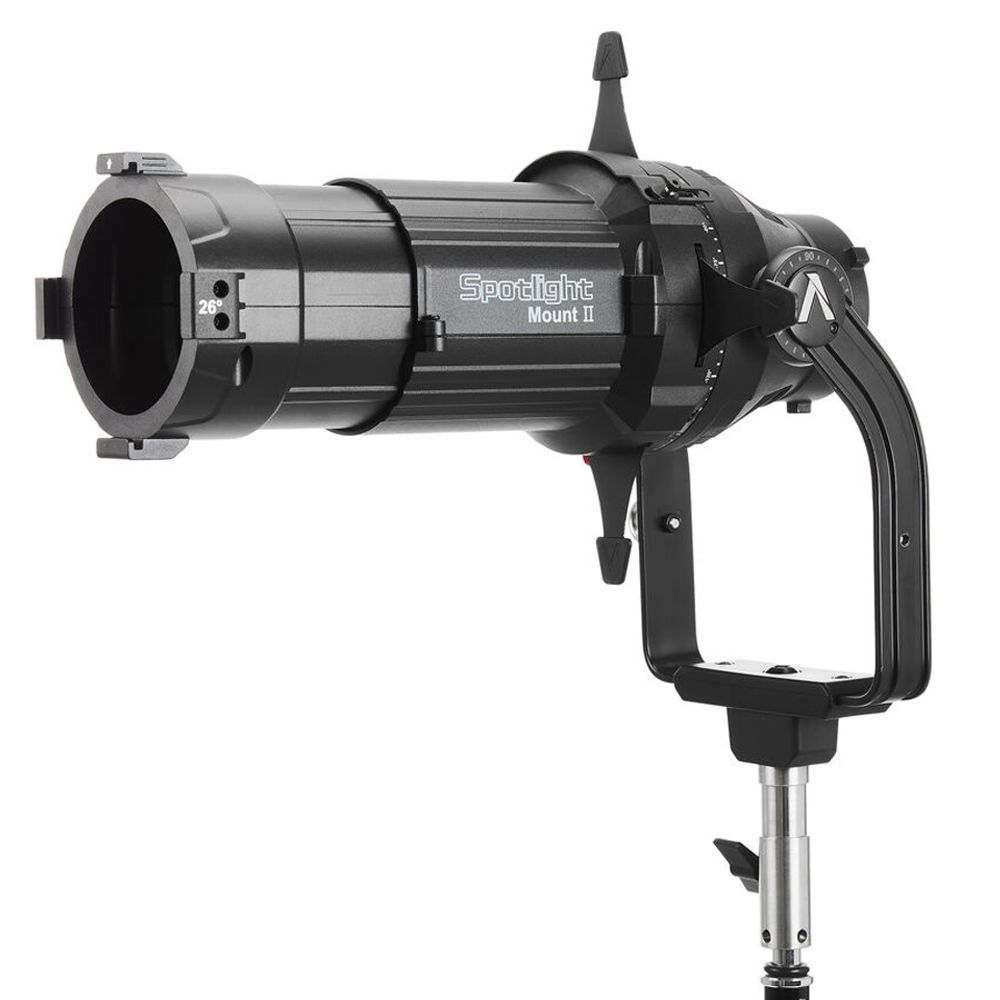 Offered here with a 26° lens, this Spotlight Mount II Kit from Apurture is an ellipsoidal projection lens modifier designed for use with ProLock mount and also compatible with Bowens mount LED fixtures. It offers up to 80° of downward tilt and allows users to precisely control beam size and projection coverage across a wide range of on-set lighting applications. Built with a durable all-metal construction, its built-in four-leaf cutter enables precise beam shaping and controlled cut light