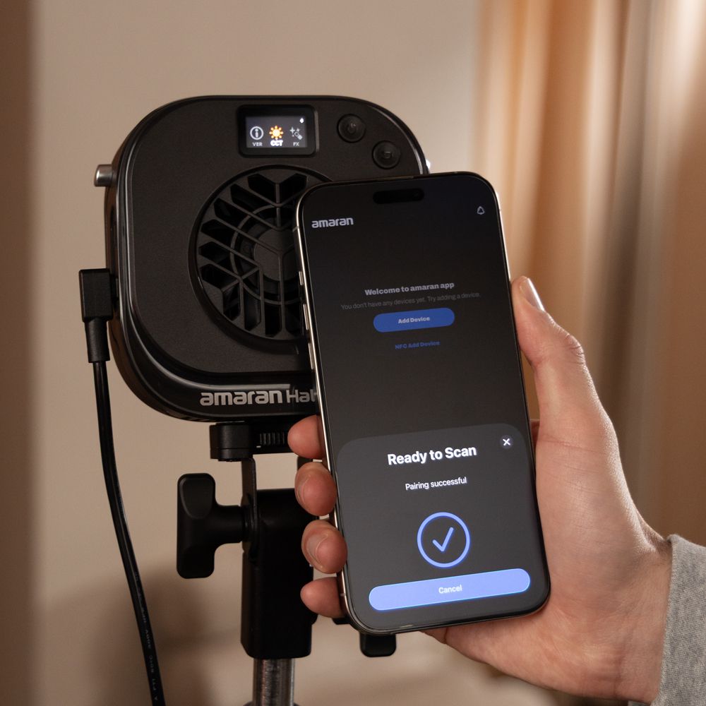 Simple controls for faster shoots. With separate brightness and colour temperature knobs and a clear, simplified interface, the amaran Halo 60x keeps adjustments fast and intuitive with virtually no learning curve. For wireless control, pair your amaran Halo 60x or multiple lights in the Halo family in the amaran app with just a tap via built-in NFC – even before turning it on.