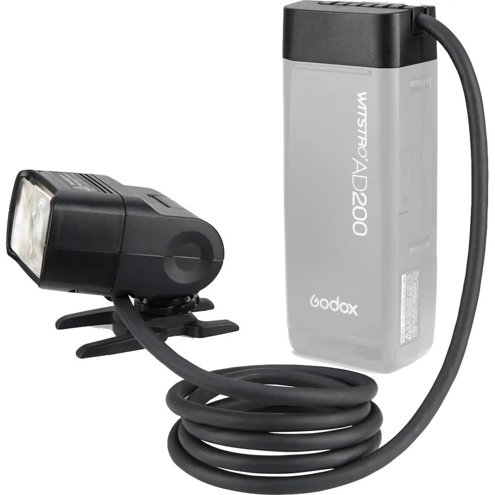 Designed for off-camera positioning, this EC200 Extension Flash Head from Godox is an interchangeable accessory for the AD200 TTL pocket flash. One of its ends attaches to the battery pack and connects to the actual flash head via a 1.8m long cable, allowing you to easily rig it to a stand or simply hold it in your hand and move it around between shots. Push a locking button on the side to allow the head to tilt upwards 90 degrees. At the bottom, a cold accessory foot can be used for mounting onto a camera hot shoe, while a 1/4"-20 thread in the middle of the foot allows attachment to compatible stands or tripods.
