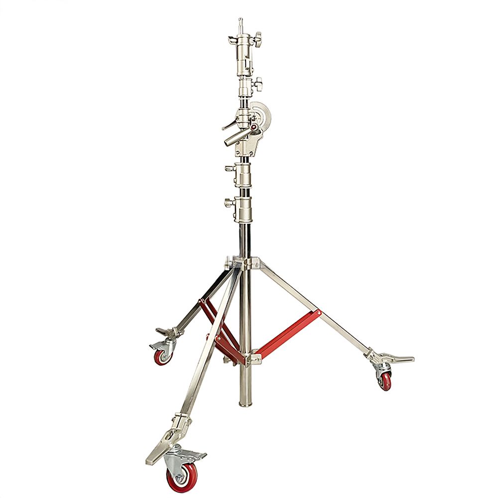 5. Three wheels with 360° swivel movements allow you to change directions at will while rolling heavy equipment from one place to another. Step-on brakes lock the wheels and secure the light stand in a position where you need it.